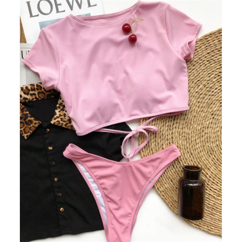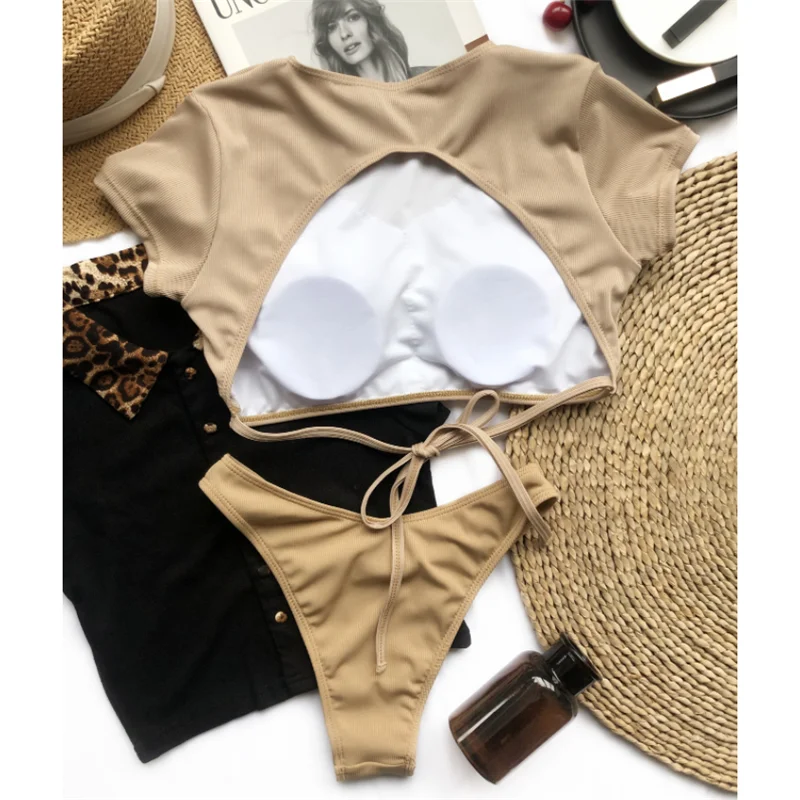 Сексуальный спортивный купальник-бикини GNIM, женский купальник пуш-ап из 2 предметов, однотонная пляжная одежда с открытой спиной, купальник с коротким рукавом, женский купальный костюм