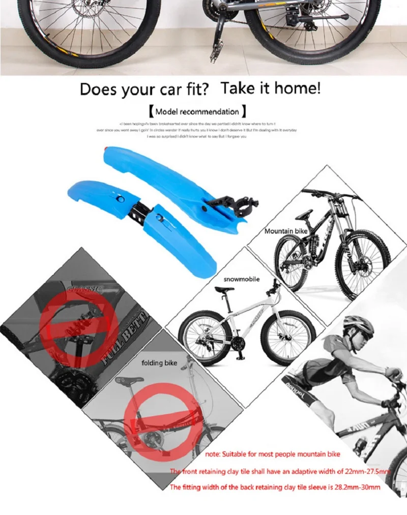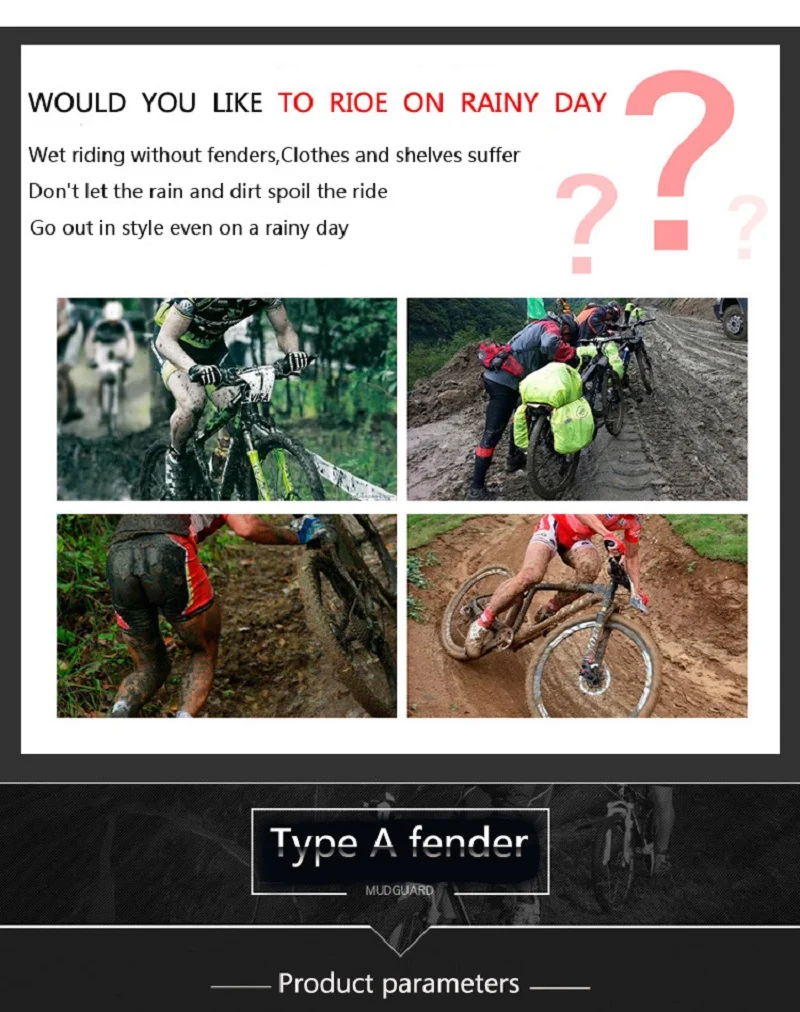 1. Дизайн для всех видов горного велосипеда. Расширяются и удлинения ресниц всего дизайн подходит для всех с толстыми покрышками (ширина шин 1,5-2,35 ') горный велосипед, удерживания воды лучше с совершенный дизайн. Не беспокойтесь за увлажнение спины.2. Передняя и задняя части используют устройство быстрого крепления.3. Хорошая прочность, может непрерывно крутить.4. Более длинный дизайн хвоста лучше удерживает воду.5. Может регулировать брызговик под любым углом.6. Быстрый дизайн, легче и быстрее для погрузки и разгрузки.