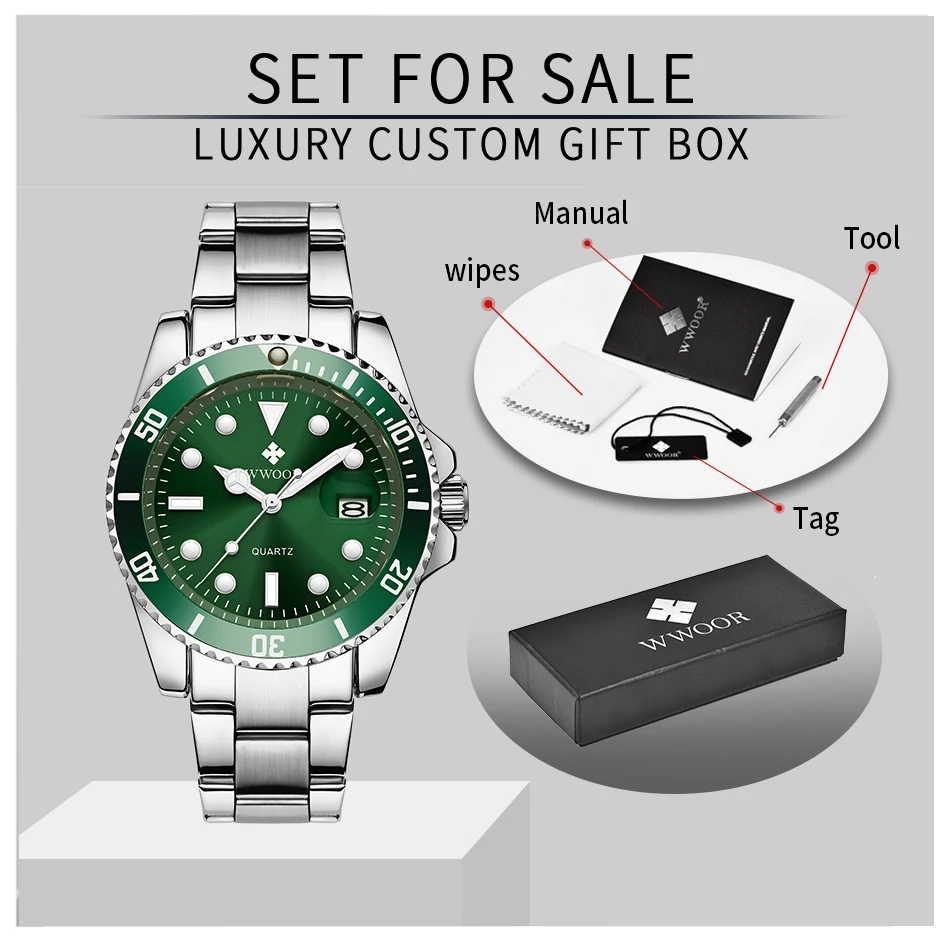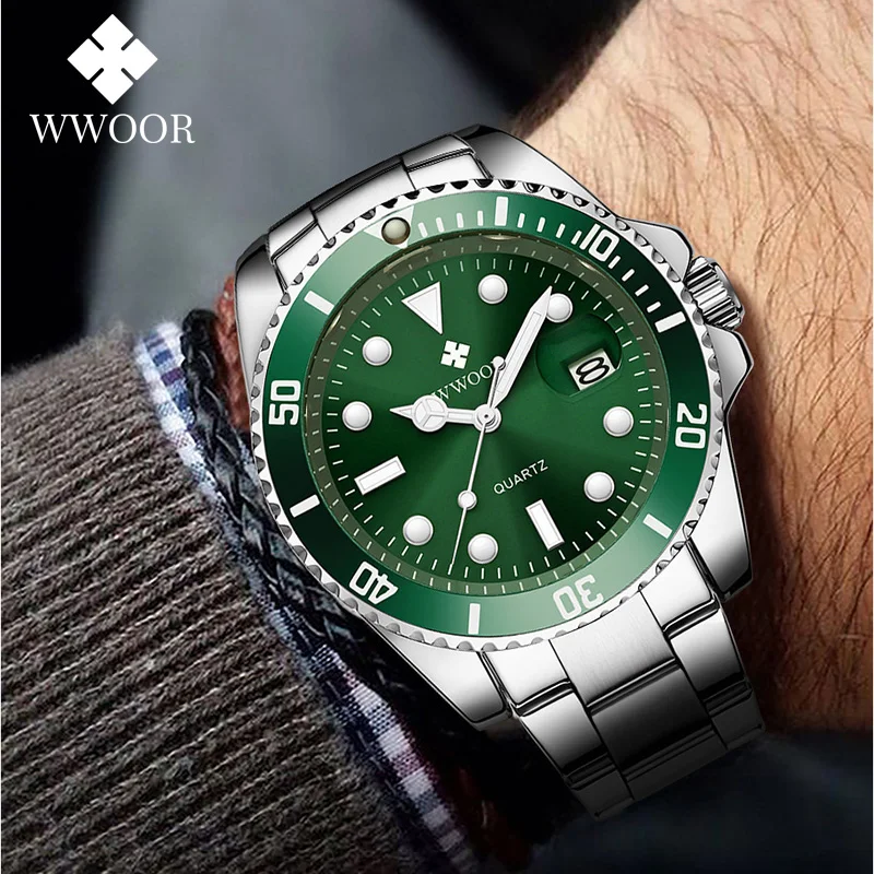 Мужские часы WWOOR, новинка 2021, Роскошные зеленые кварцевые мужские часы с автоматической индикацией даты, светящиеся водонепроницаемые спортивные часы для дайвинга, мужские часы