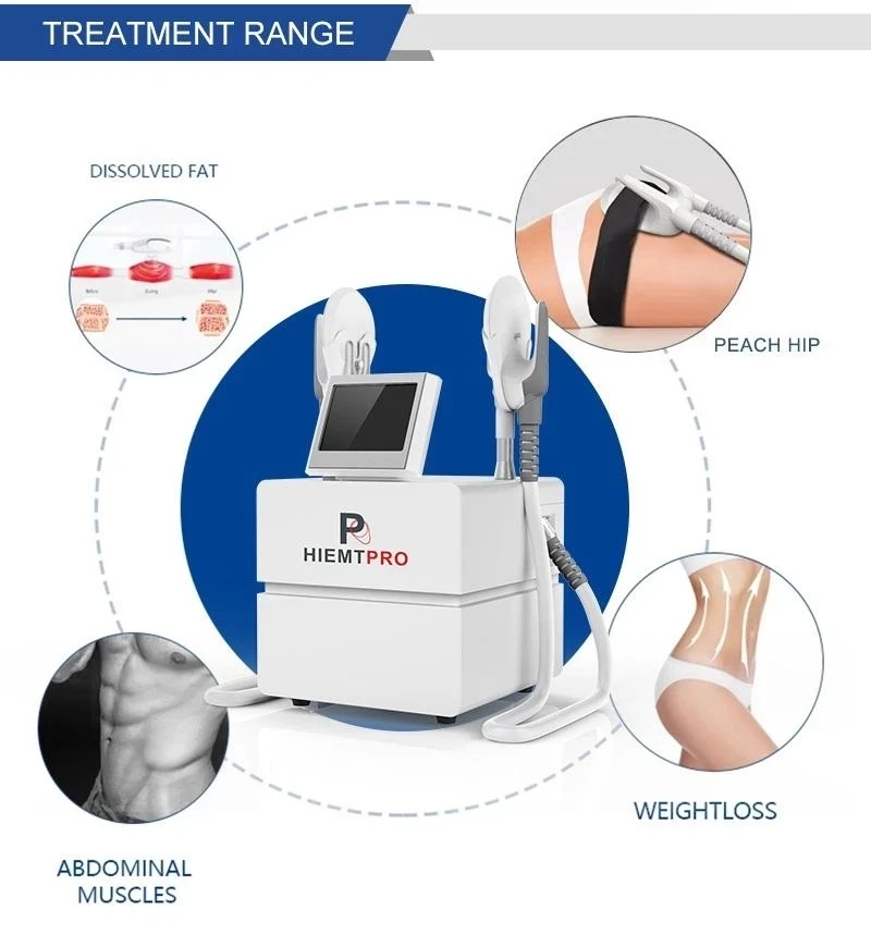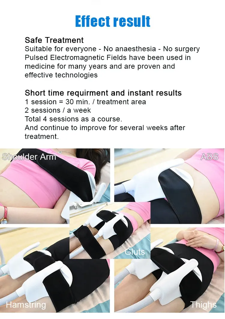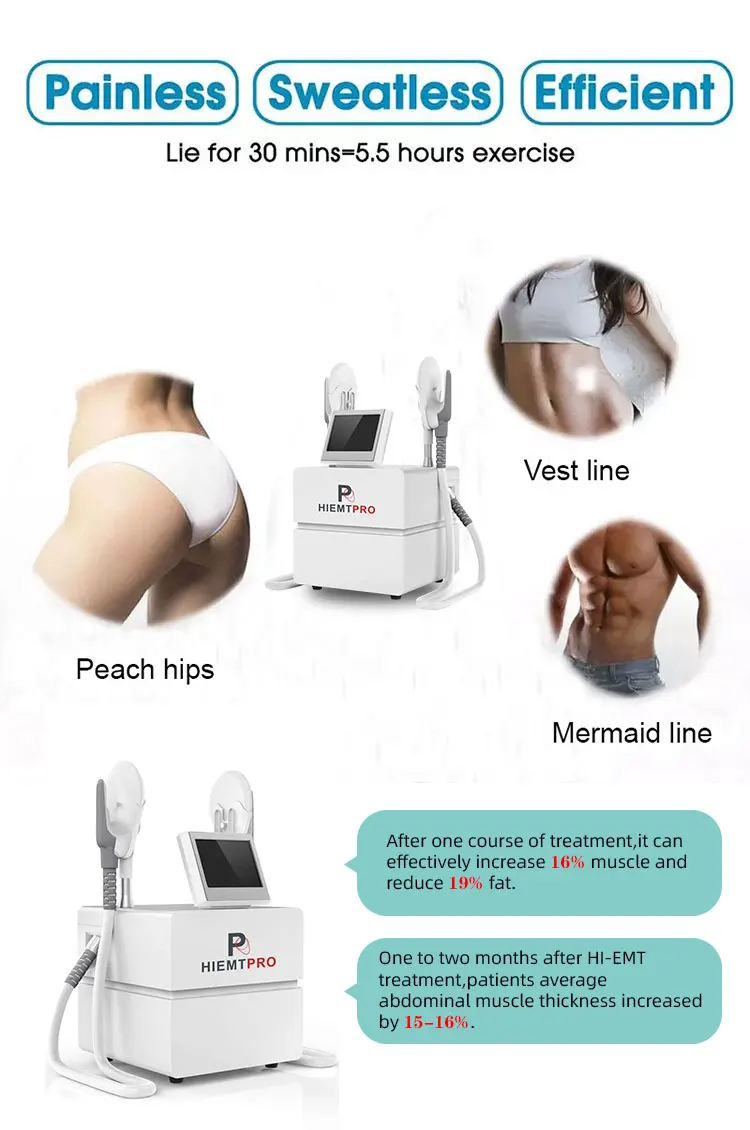 Нарастите мышцы, мышцы сжимаются в 30 000 раз с высокой частотой и интенсивностью, так что aslo тренируются и увеличивают мышечную плотность и объем. Уменьшение сжигания жира в мышцах требует большого количества энергии, поэтому жировые клетки рядом с мышцей также потребляются, что приводит к естественному апоптозу и эффективному снижению толщины жира. Мышцы лепить, тренируя мышцы живота, формируя линию жилета/тренируя мышцы бедер, создавая персиковые бедра/тренируя мышцы живота косой, и формируя линию русалки. Лечение разделение RECTUS только HIEMT приносит неинвазивные технологии для послеродовых женщин и решает проблему rectus