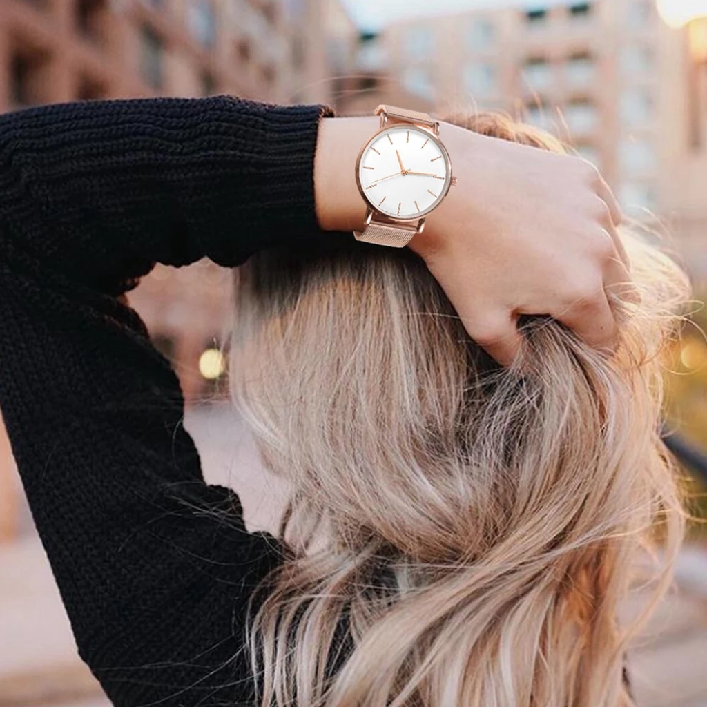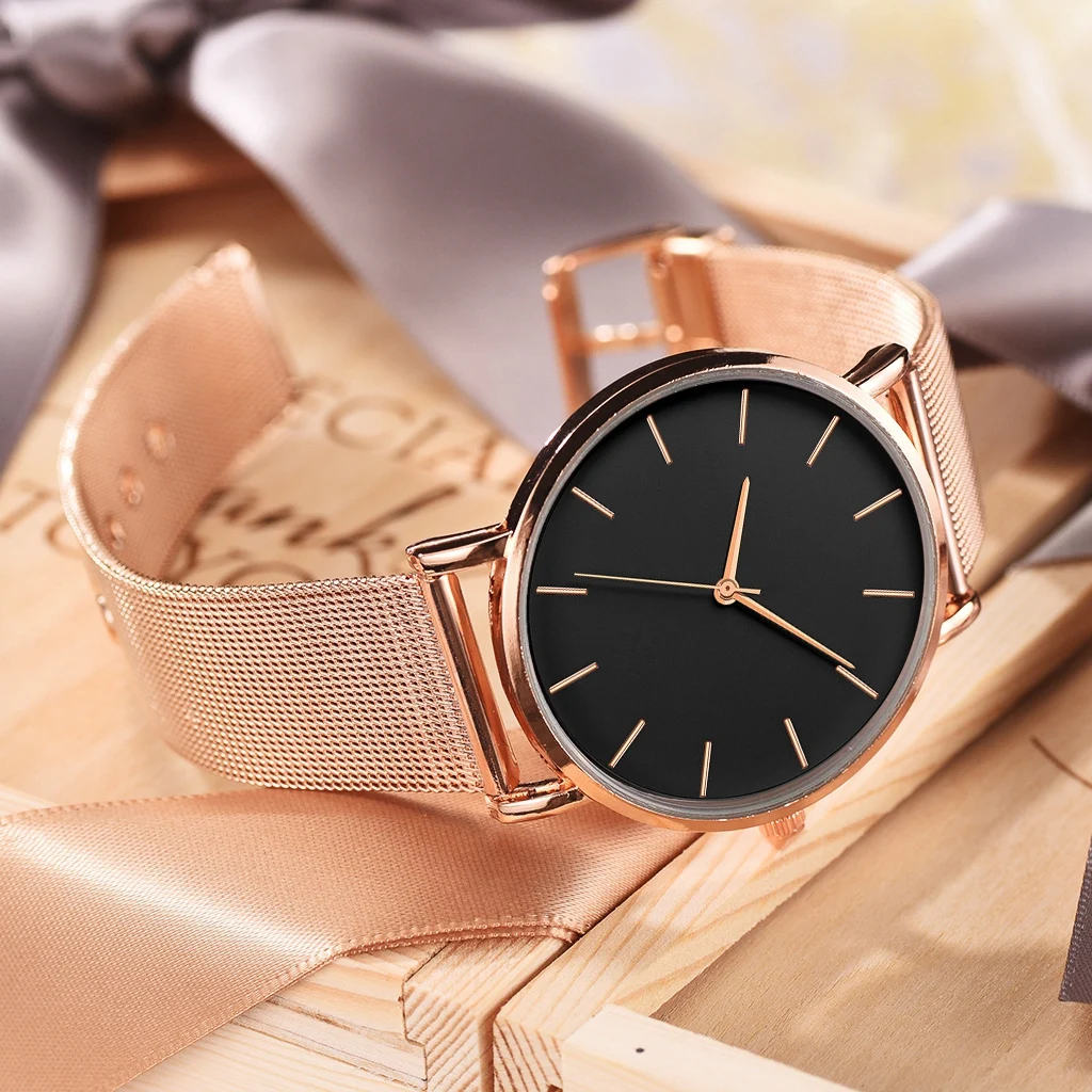 Часы женские кварцевые с большим циферблатом, люксовые простые дамские часы из нержавеющей стали цвета розового золота с сетчатым ремешком