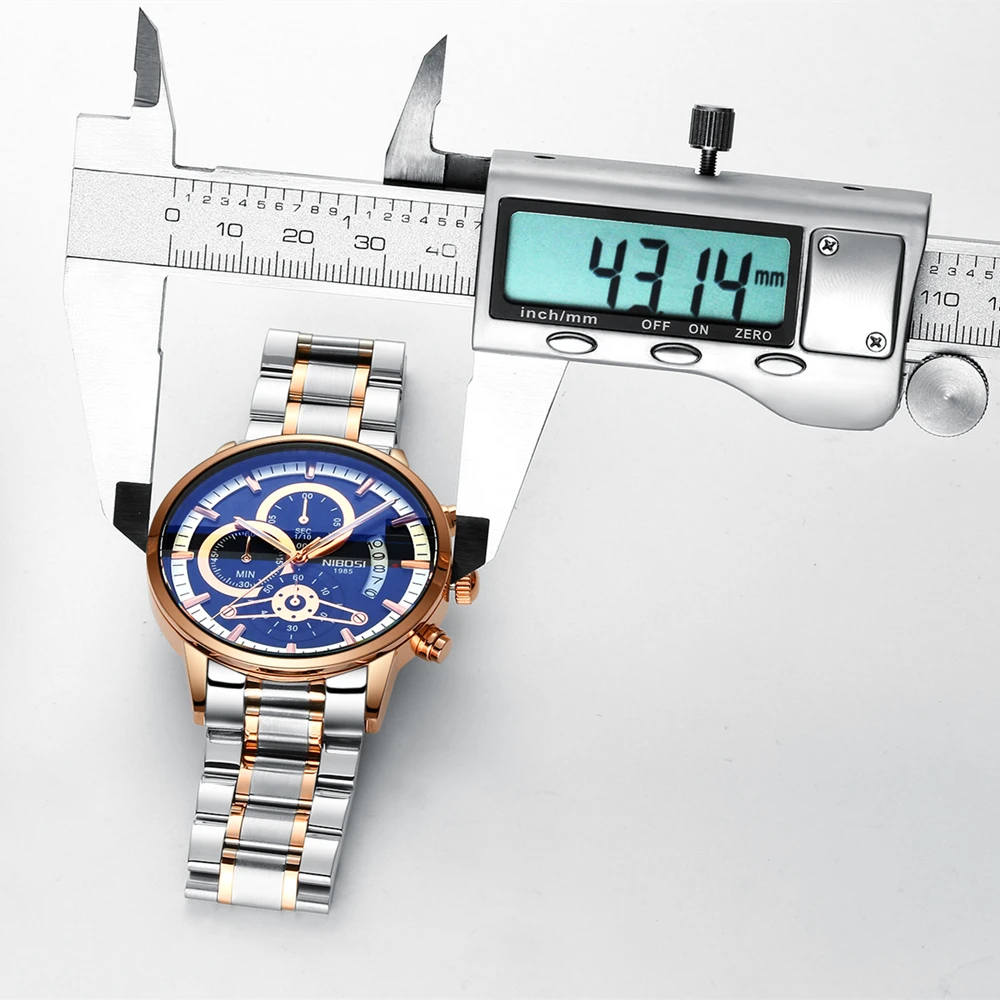 -1 x часы NIBOSI-1 x коробка NIBOSI-1 Инструкция-1 х ткань для чистки часов-1 гарантийный талон-1 инструмент для регулировки ремешка