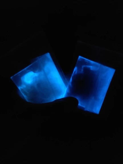 Слева на фото белый, справа голубой. Если зарядить на свету, то отлично светится в темноте. На втором фото темные пятна - это места, где не зарядилось из-за наклейки. Цвета белый и голубой при дневном свете и одинаковый яркий голубой ночью. Рекомендую!