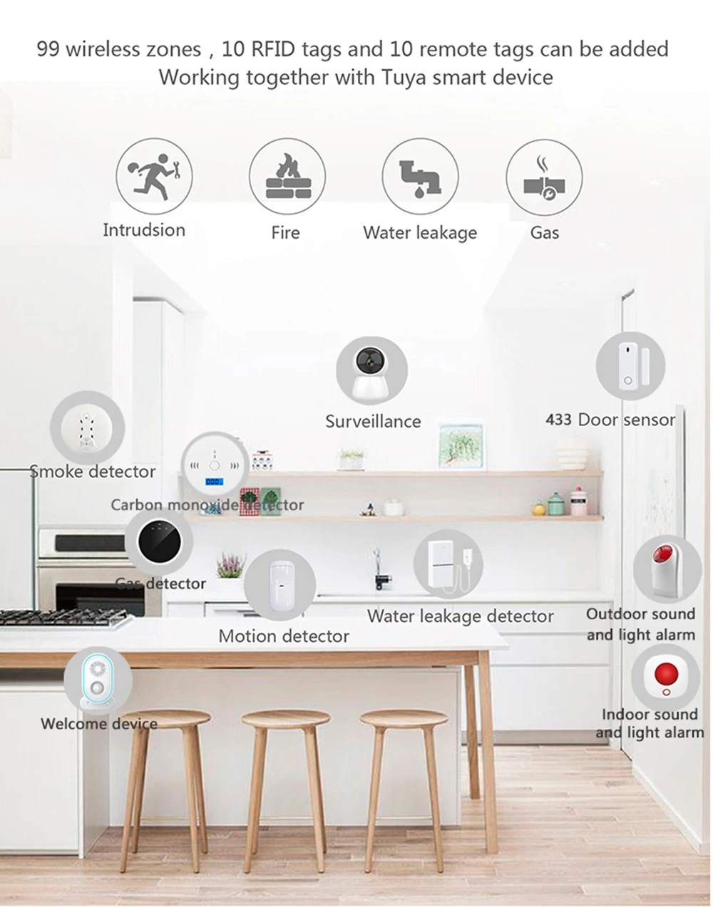 Можно добавить 99 беспроводных зон, 10 rfid-меток и 10 удаленных меток, работающих вместе с умным устройством Tuya