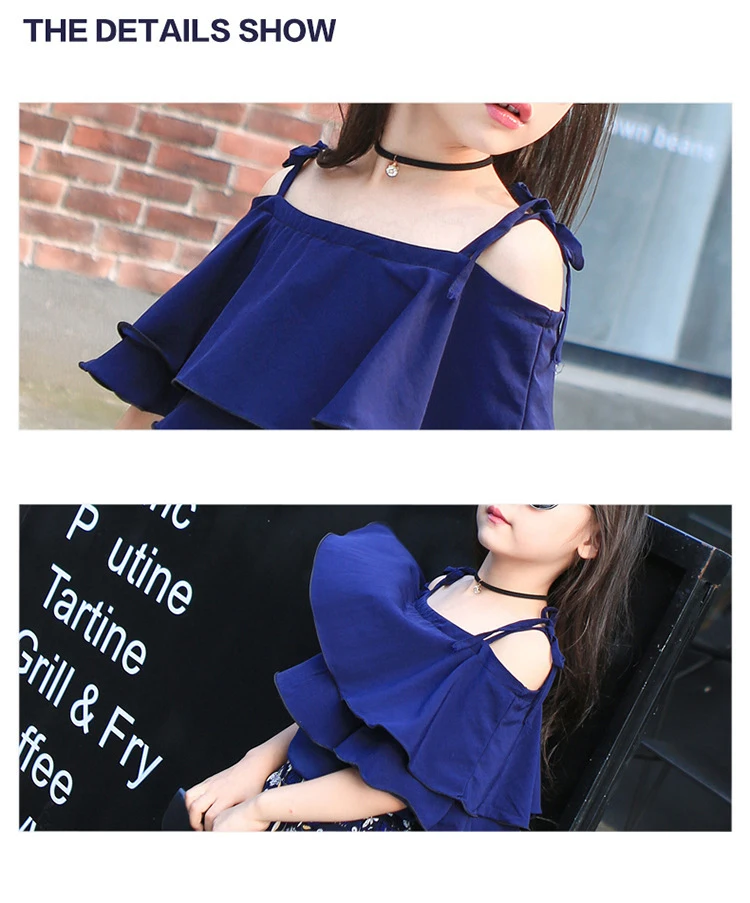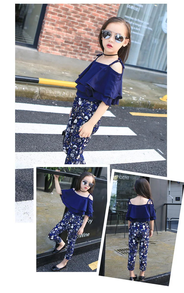 Комплект летней шифоновой одежды для девочек-подростков, топ с открытыми плечами и штаны с цветочным принтом, одежда для детей 8, 12, 14 лет