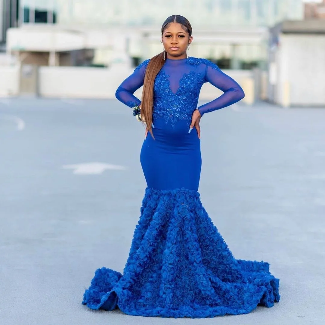 Синий Русалка платье для выпускного вечера с круглым вырезом одежда с длинным рукавом блесток аппликация оборки Тюль пол Длина размера плюс Для женщин вечерние платья