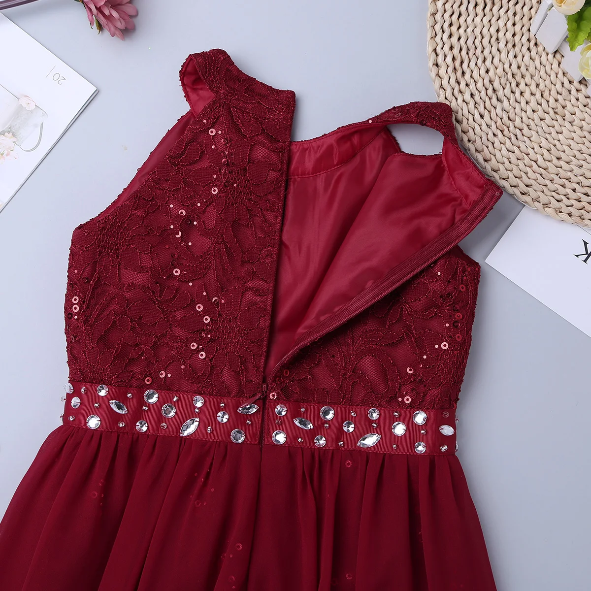 # Детей от 6 до 14 лет, платье для девочек без рукавов, кружево с цветочным мотивом Стразы Макси комбинезон платье для торжественных событий, школьный танцевальный День рождения