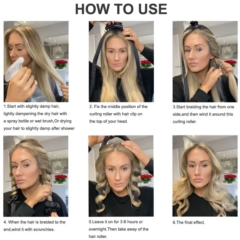 3.Как использовать:Перед тем как ложиться в кровать, используйте мелкохвостый гребень, чтобы отделить небольшой пучок немного длинных волос, оберните его на стержень для завивки и закрепите резиновой лентой без нагрева. На следующее утро у вас будут красивые вьющиеся волосы, и эта повязка для завивки не вызовет дискомфорта во время сна.