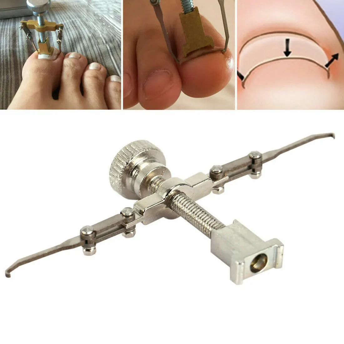 Как использовать: 1. Используйте горячую воду 35 градусов, чтобы замочить стопу около 20 минут 2. Крюк с обеих сторон вросшего ногтя с двумя крючками на оборудовании. 3. Используйте ручную фиксацию среднего отверстия инструмента, скручивая гайку, чтобы закрепить оборудование на носовой части с другой стороны (опорная часть в два направления для различных размеров гвоздей) 4. Медленно усиливается, пока не появится ощущение расширения (без боли). (при коррекции ноги могут замачивать в теплой воде) 5. Слегка усиливается каждые 10 минут. 6. Через 30 минут выньте ноги из воды, подождите 15 минут, чтобы высушить ноги. 7. Извлеките оборудование, ноготь имеет форму, положение, наденьте немного медицинского хлопка под наклонными ногтями, чтобы предотвратить отскок.