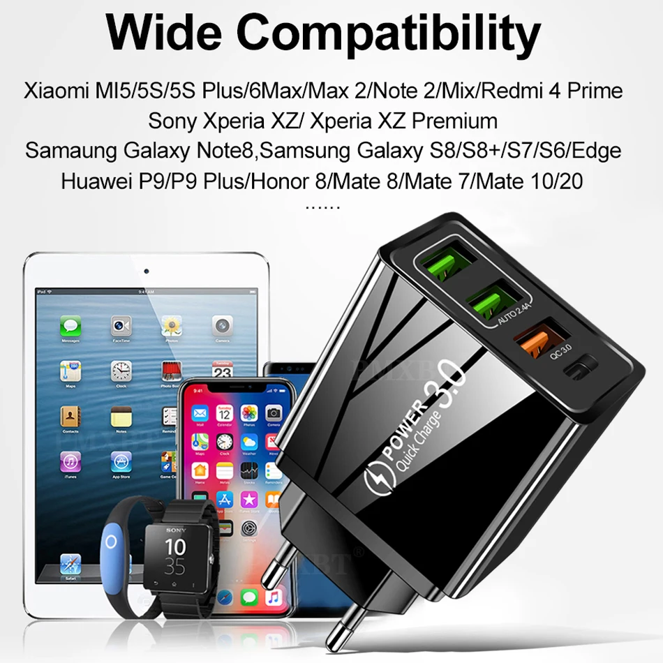 Быстрое зарядное устройство USB 36 Вт, 4 порта, QC3.0, Тип C PD 20 ...