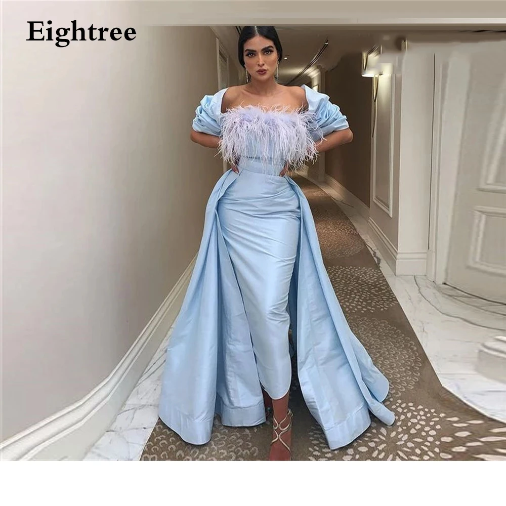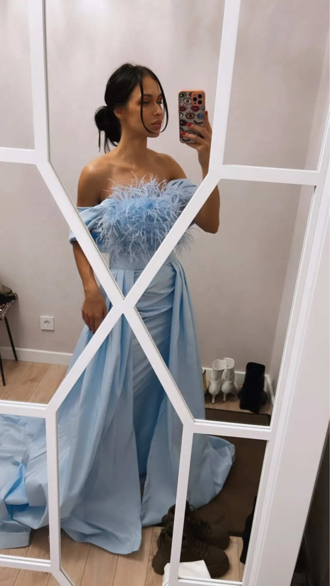 Платье-Русалка с рукавами-шлейфом и перьями, небесно-голубого цвета