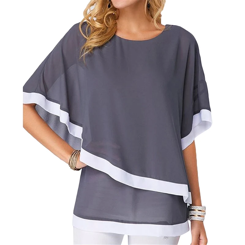 Размера плюс блузки для женщин 5XL лоскутное двойной Слои повседневные топы с рукавами летучая мышь Пляжная туника 2021 осень большие размеры шифон рубашки для мальчиков