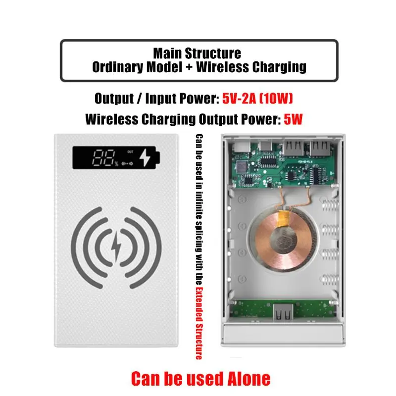 Комбинированный беспроводной зарядный ЖК-дисплей DIY 18650 Чехол Для Аккумулятора Внешний аккумулятор корпус портативная внешняя коробка безOOTDTYОписание:100% новый товар высокого качества.Характеристика:Можно комбинировать в неограниченном соединении, в соответствии с вашими личными потребностями. Расширительная структура должна быть приобретена отдельно.Изготовлен из высококачественного материала, износостойкий и прочный.ЖК-цифровой дисплей, легко для вас контролировать емкость аккумулятора в реальном времени.Быстрая зарядка, подключи и работай, долгое время зарядки.Мини Портативный дизайн, удобно носить с собой. Светильник вес дизайна очень легко носить с собой.Совместимость с 99% usb-устройствами, такими как смартфоны, планшеты, компьютеры и так далее.Функция: Защита от температуры, защита от короткого замыкания, защита от сброса, защита от обратного соединения, защита от перегрузки по току, защита от перенапряжения, защита от перегрева батареи.Дизайн «сделай сам», прост и удобен в использовании. Идеально подходит для путешествий на открытом воздухе.Чехол только для внешнего аккумулятора, другие аксессуары на фото не включены!Советы:18650 батареи не включены в посылка, вы должны приобрести отдельно.Можно использовать только батарею 18650, положительным электродом которой является плоский верх.Пожалуйста, обратите внимание на направление положительных и отрицательных полюсов.Основная структура может использоваться отдельно, удлинительная структура не может использоваться отдельно.Характеристики:Тип товара: чехол для внешнего аккумулятораВариант A: основная структура без беспроводной зарядки (Выходная/Входная мощность: 5V-2A 10 Вт)Вариант B: основная структура с беспроводной зарядкой (Выходная/Входная мощность: 5V-2A 10 Вт; Выходная мощность беспроводной зарядки: 5 Вт)Вариант C:4 батареи-удлинительБатарея: 18650 (не входит в комплект)Материал: пластикРазмер: 13,5х8х2, 3 смЦвет: белый, черный (опционально)Количество: 1 шт.Примечание:Перевод ед. измерения: 1 см = 10 мм = 0,39 дюймовВозможны отклонения в 0-1 см вследствие измерений вручную. Пожалуйста, убедитесь, что вы не возражаете, прежде чем сделать ставку.Из-за разницы между различными мониторами изображение может не отражать фактический цвет изделия. Спасибо!Посылка включает в себя:Вариант A: основная структура без беспроводной зарядкиВариант B: основная структура с беспроводной зарядкойВариант C: удлинительная структура