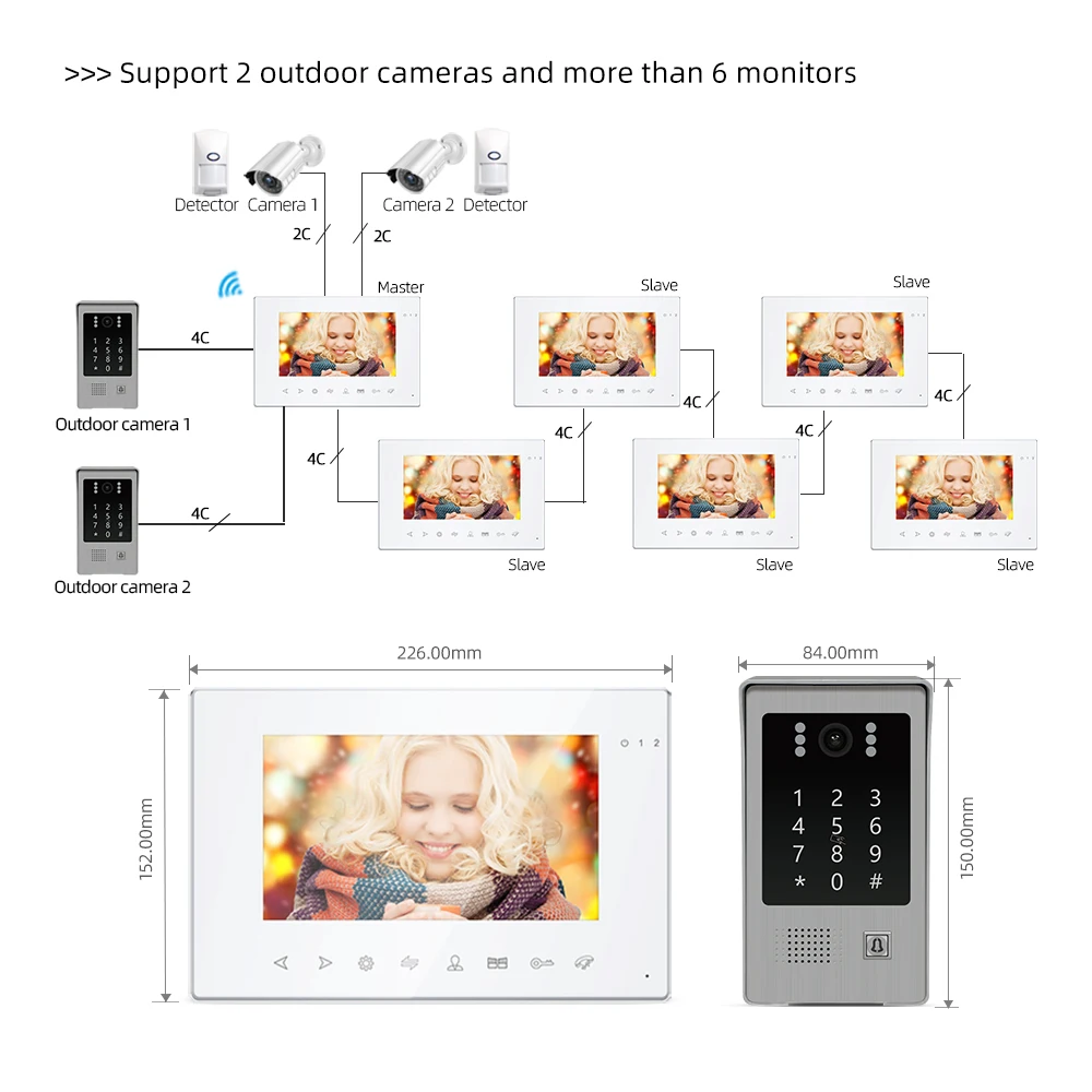 Поддержка монитора для подключения 5 внутренних мониторов, 2 замков, 2 панели вызова и 2 камеры наблюдения в основном, этот товар является бесплатным и доступен для двусторонней связи. Он поддерживает связь между внутренним монитором и наружной камерой, но также поддерживает связь между монитором и монитором. Вы не всегда спустились вниз, откройте дверь после установки нескольких домофонов