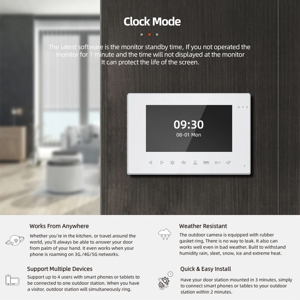 Обратите внимание, что система видеодомофона Wi-Fi не означает, что вам не нужен провод. Монитор поддерживает беспроводное подключение к Wi-Fi, но внутренний монитор и дверной звонок проводной, что гарантирует питание, видео работает стабильно, и вы можете увеличить расстояние