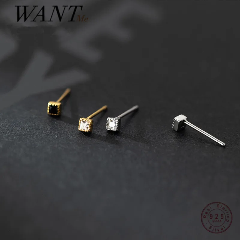 Женские маленькие серьги-гвоздики WANTME, из стерлингового серебра 925 пробы с простым геометрическим квадратом и черным цирконием, милые ювелирные украшения для пирсинга