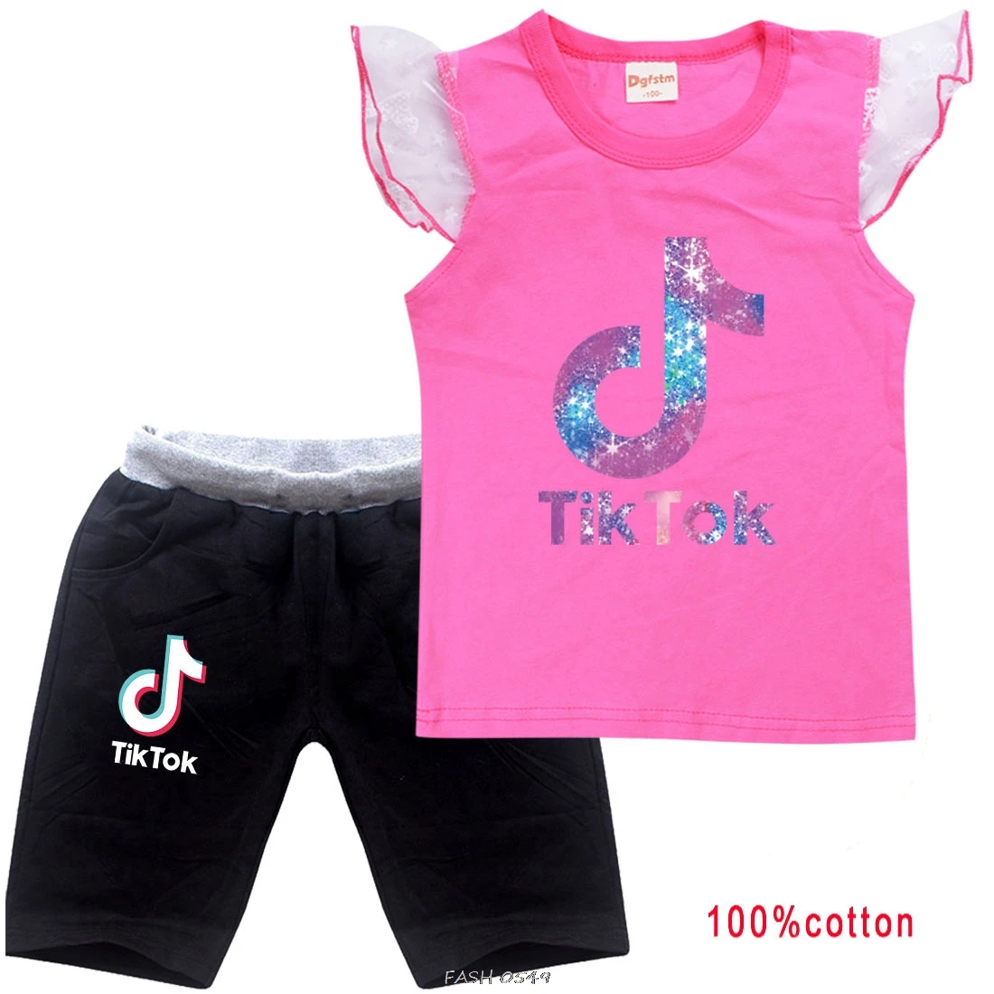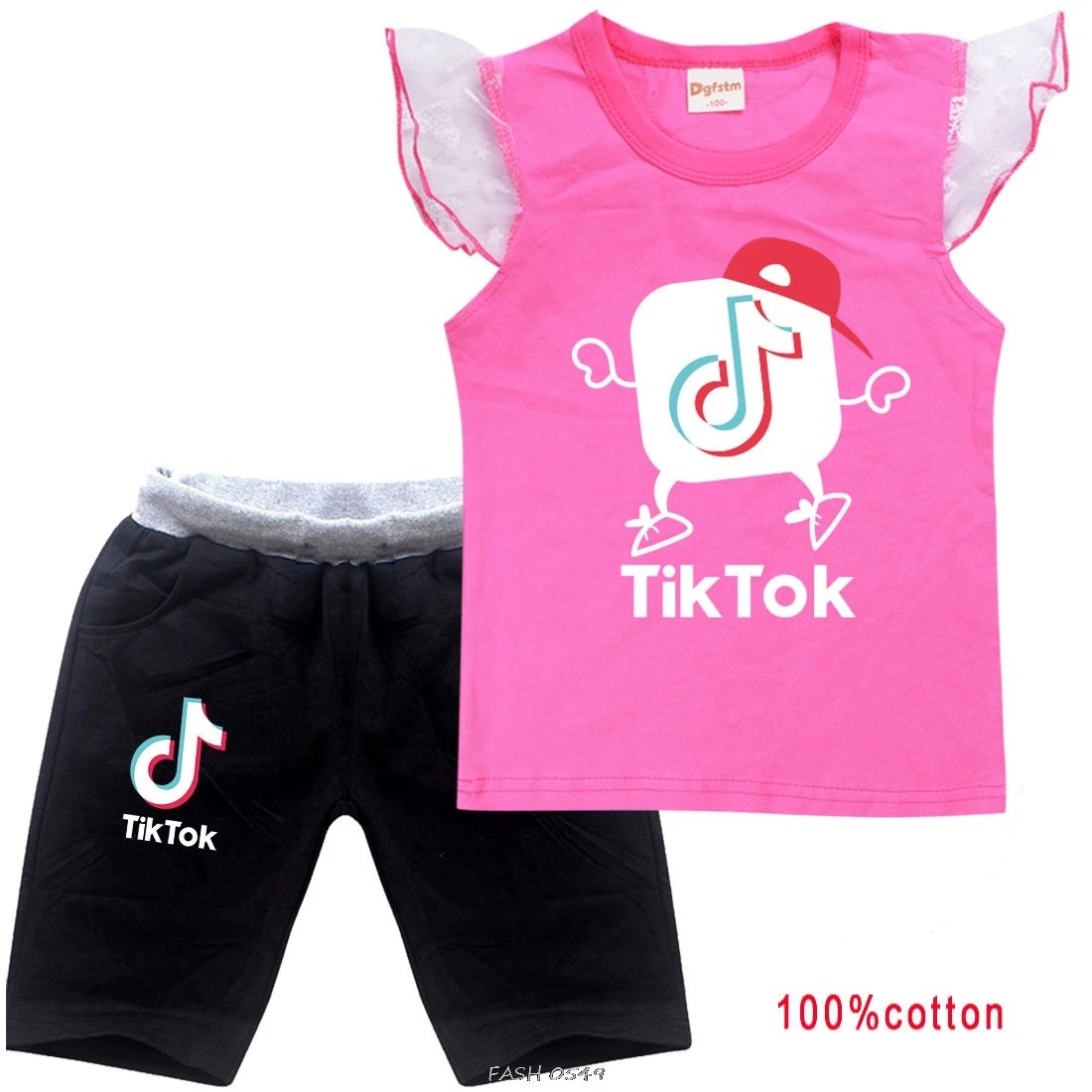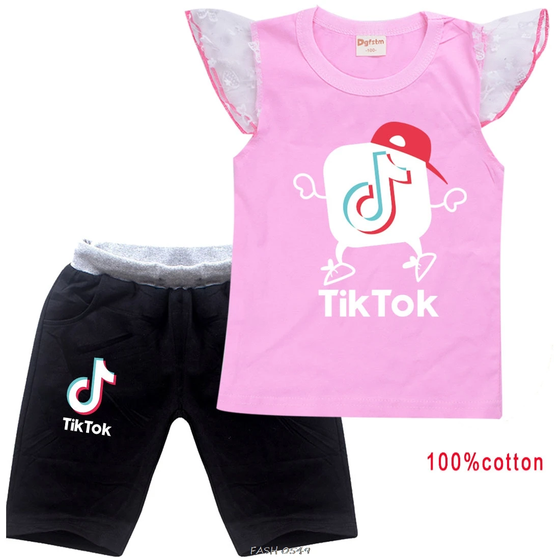 Детские тик ток для детей ясельного возраста, одежда для мальчиков, летние хлопковые футболки с короткими рукавами для мальчиков; Футболка + шорты Tik Tok косплей костюм милые топы для девочек, комплект со штанами