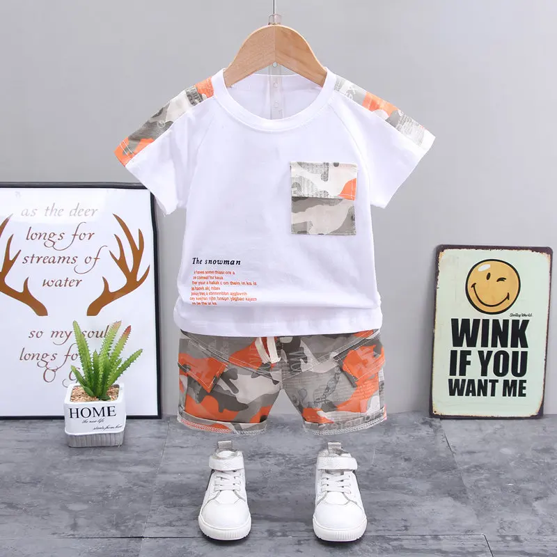 Летняя хлопковая одежда для маленьких мальчиков и девочек, Спортивная футболка, камуфляжные шорты, 2 шт.компл., спортивные костюмы для младенцев и детей ясельного возраста