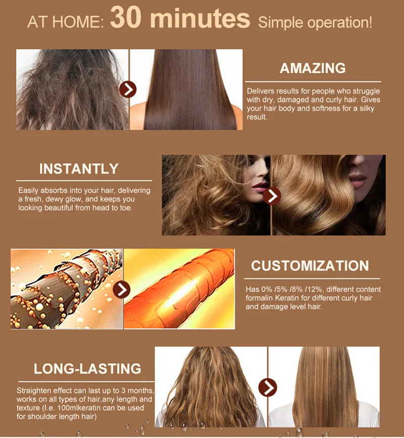 Метод 1: Используйте разное содержание кератина формалина для разных вьющихся волос. Для маленьких вьющихся волос (0% формальдегида бесплатно) Для нормальных вьющихся волос (5% Формалин) Для Глубоких вьющихся волос (8% Формалин) Для очень вьющихся волос (12% Формалин) Метод 2: Используйте различные формы содержания кератина. Если вы находитесь на Ближнем Востоке, пожалуйста, выберите кератин 5% или 8% Формалин Если вы находитесь в Южной Америке, пожалуйста, выберите кератин 5% или 8% Формалин Если вы находитесь в Африке, пожалуйста, выберите Кератиновый кератин 8% или 12% Формалин