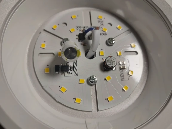 По светильникам сложилось неоднозначное мнение. С одной стороны мощность и теплота света соответствует заявленным характеристикам, и мерцание полностью отсутствует, с другой стороны при такой мощности сам светильник нагревается до 55°C.При такой температуре светодиоды долго не проживут. Ещё крайне не понравилось, что конструкция светильника неразборная. Он состоит из цельного металлического корпуса и в паз при сборке вставляется светоотражатель. Вставить то его очень легко, а вот снять практически невозможно, в пазу он сидит очень плотно. Но, есть хитрость, если с силой дуть в отверстие от куда выходит питающий провод, то светоотражатель из паза вылетает. Именно так я и добрался до его внутренностей. Что находится внутри можно увидеть на фото. БП вполне приличный, с хорошей ёмкостью, дросселем и специализированной микросхемой. Ещё раз подчеркну, мерцаний нет, но очень сильный нагрев всё портит. Поэтому 4 звезды.