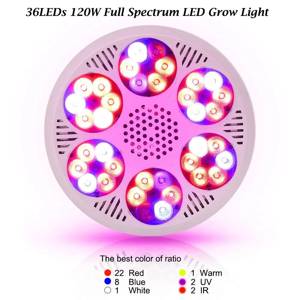 Полный спектр36 высокоэффективных чипов LEDchips: 22 красных + 8 синих + 1 белый + 2 ИК + 2 УФ + 1 теплый белый; Растсветильник обеспечивает наиболее эффективные длины волн светильник для повышения производительности фотосинтеза, помогают растениям расти здоровее.