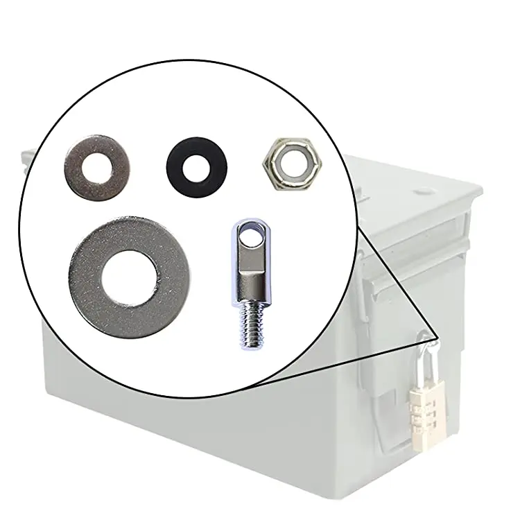 Инструкции:1) Закройте крышку и защелку жестянка с боеприпасами и отметьте центр отверстия, на котором будет установлено фиксирующее оборудование (постарайтесь быть точным!)2) Просверлите отверстие 5/16 дюйма в банке по Центральной отметке (может быть полезно предварительно просверлить направляющее отверстие меньшего размера)3) сформируйте внешнюю часть банки, вставьте Стопорную шпильку в отверстие для сверления4) на внутренней стороне банки Наденьте Неопреновая шайба на резьбу стопорной шпильки, затем Маленькая в форме шайбы, а затем нейлоновую стопорную гайку. Затяните сборку гаечным ключом, имея в виду, что «круглая» сторона стопорной шпильки может иметь острые края/заусенцы, поэтому инструмент должен использоваться на «круглой» стороне, не голыми руками5) для жестянка с боеприпасами s с большими отверстиями поместите большую шайбу между защелкой жестянка с боеприпасами и навесным замком, чтобы предотвратить проскальзывание большого отверстия защелки на навесной замок-Если вы завершите сборку и обнаружите, что Стопорная шпилька не по центру, просто подпилите или Просверлите отверстия защелки жестянка с боеприпасами, чтобы они были больше, пока защелки не подходят для стопорной шпильки.