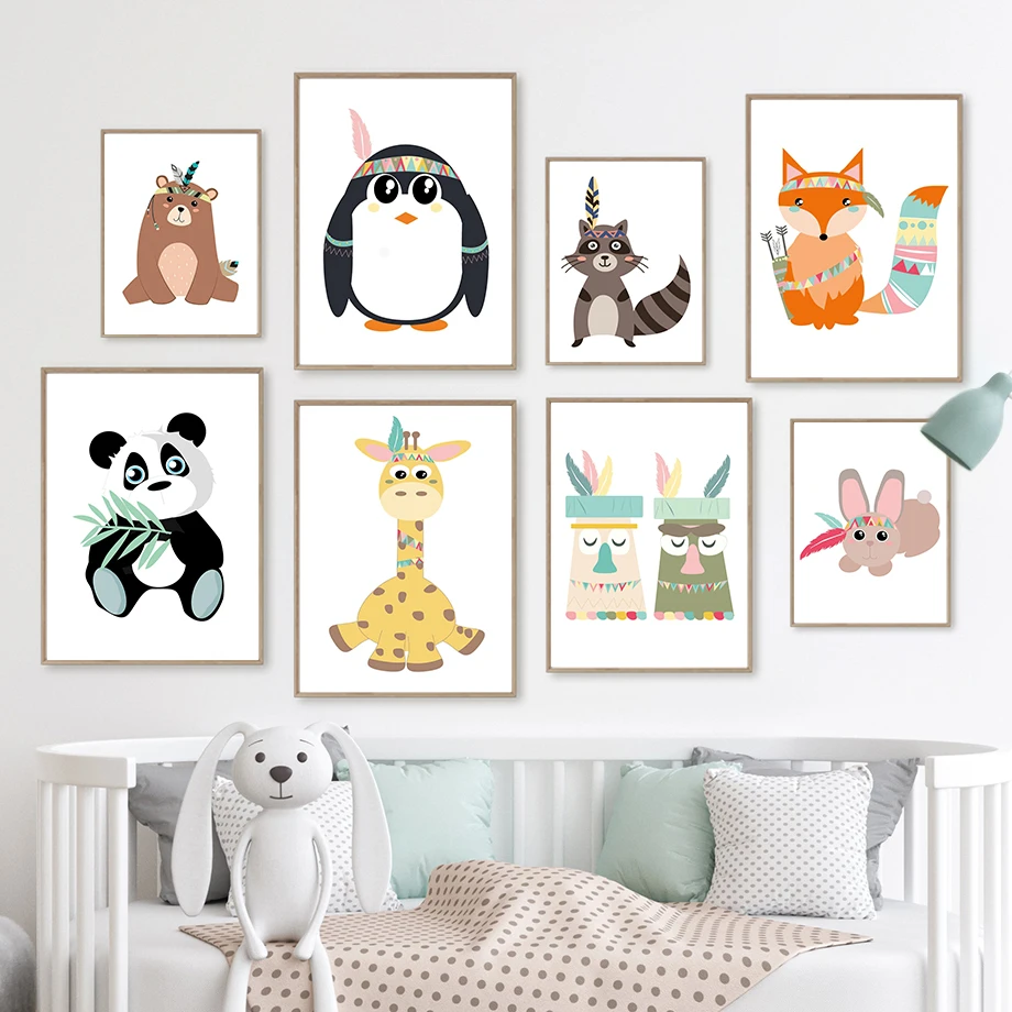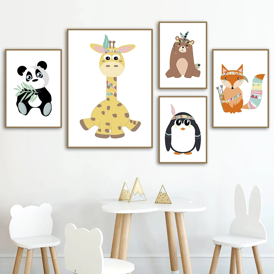 Индийские животные, настенная Картина на холсте, лиса, кролик, жираф, пингвин, панда, скандинавские постеры и принты, картины, декор для детской комнаты