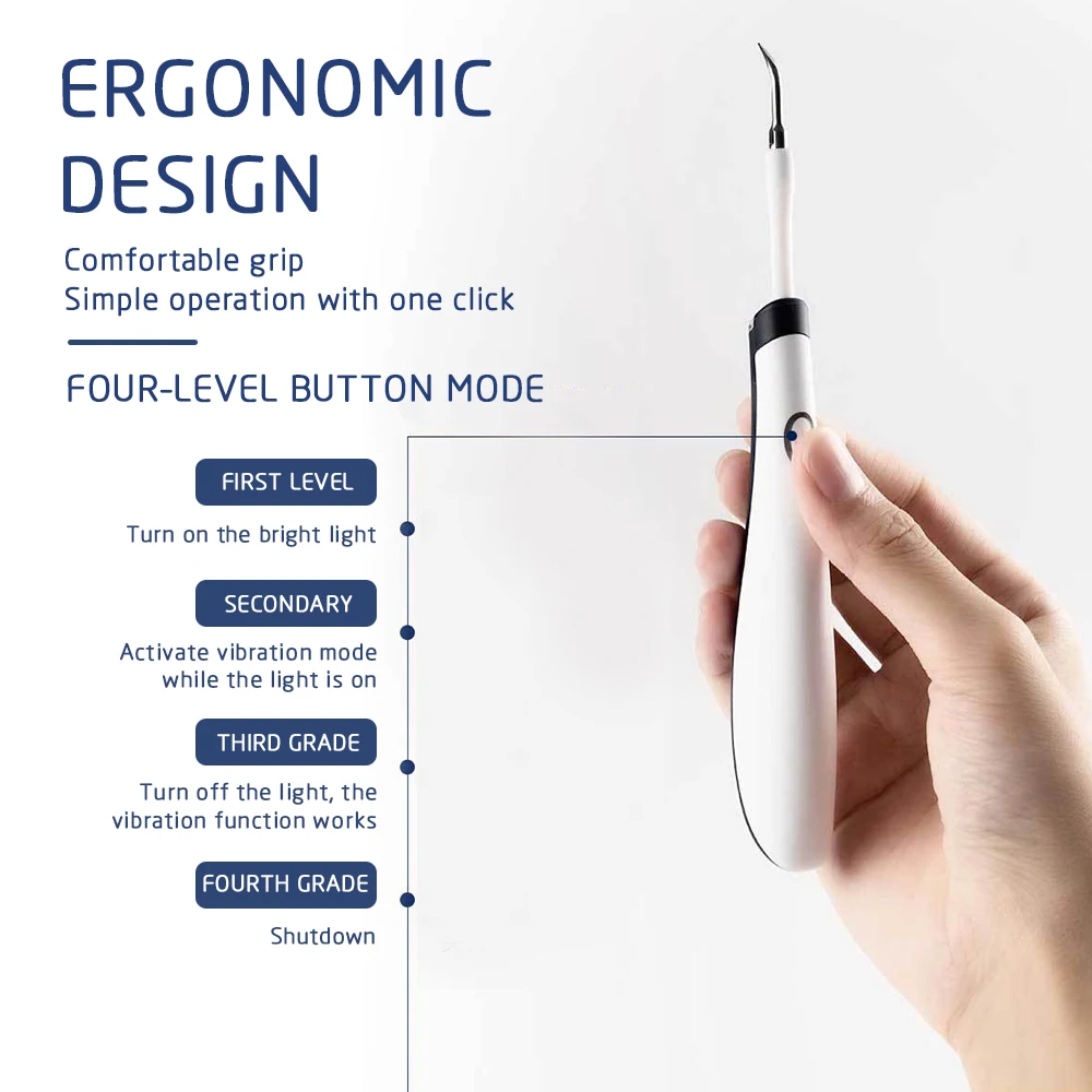 Этот продукт использует чистящую головку с такой же структурой, как у стоматолога, который может эффективно удалить очевидное вычисление.1. Ультразвуковая вибрация, интеллектуальная высокочастотная вибрация, может вибрировать 10800 раз в минуту;2. Интегрированная конструкция фюзеляжа интегрирует содержимое традиционного хоста в ручку, что более удобно, легко захватывается3. Медицинская легированная сталь Легко удаляет калькулятор, пятна чая, пятна дыма;4. Пятискоростная Регулировка прочности, Чжан Чи удобная и удобная;5. Водонепроницаемый уровень IPX6, используйте чистку, чтобы быть более здоровым, подходит для ежедневного использования.(Примечание: металлическую головку очистителя зуба нельзя заменить; Этот продукт не легко подвергать воздействию солнца; Не краску изделие водой в течение длительного времени; этот товар только для взрослых, вдали от детей)