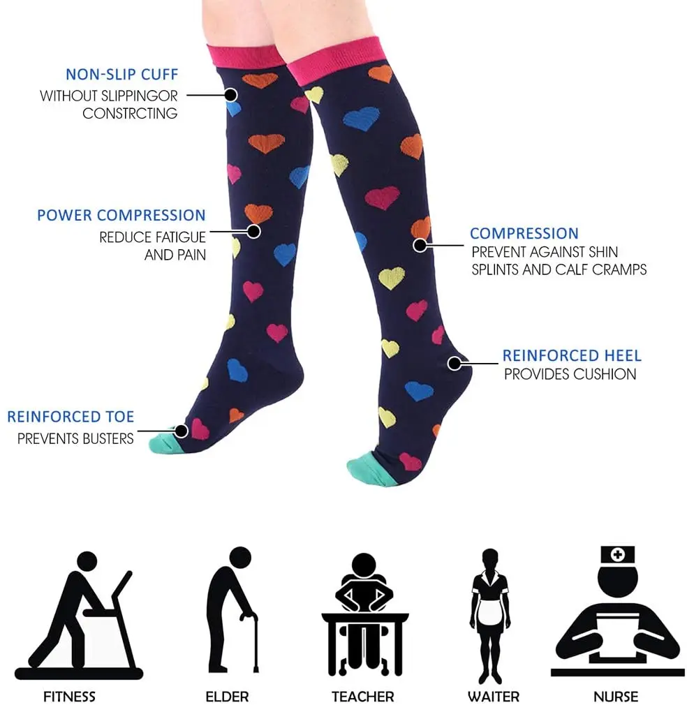 Забавные неподходящие дизайныХорошо, если вы хотите быть другим, просто посмотрите здесь сейчас. Наши носки яркие и веселые! В любое время наши носки тщательно разработаны и дизайн узора очень отличительный. Часть носка и пятки усилена для дополнительной поддержки и комфорта. Очень прочный с модным видом и разнообразными цветами. Наши носки универсально подходят для всех рабочих профилей, включая повседневные, спортивные и авантюрные мероприятия. Лучше подходитМатериал наших компрессионных носков улучшен с процентом нейлона от 40% до 85%. Обеспечивает растягивание на 360 градусов для большей гибкости и долговечности. Мы тщательно разработали и изготовили наши компрессионные носки, чтобы обеспечить превосходную поддержку, комфорт и облегчение без ущерба для вашей подвижности. Облегающая форма, легкая и дышащая ткань обеспечивает стабильность суставов независимо от активности. Компрессионные носкиНаши компрессионные носки (20-30 мм рт. Ст.) рекомендованы врачами и предпочтительны тренерами. Компрессионные чулки создают максимальное поддерживающее давление на лодыжке и постепенно уменьшают ноги, улучшая кровообращение и снимая боль в ногах. Дышащая высококачественная ткань обеспечивает оптимальную температуру. Бактерии и влага для максимального уровня комфорта. Идеально подходит для людей, которые сидят в течение длительного времени во время поездки или работы. Преимущества сжатияМетоды сжатия научно доказаны, чтобы обеспечить облегчение варикозного расширения вен, обжатия икры или других проблем с отеками ног. Облегающая форма, легкая и дышащая ткань обеспечивает стабильность суставов независимо от активности. Компрессия и поддержка идеально расположены на пятке ног икры и области носка не будет сжимать ваши ноющие суставы. Влагоотводящие свойства быстро высыхают на воздухе в течение нескольких часов. Которые могут извлечь выгоду из компрессионных носков:1. Беременная женщина2. Спортсмены и активные люди занимаются спортом, бегом, пешим туризмом, велоспортом, футболом и т. д.3. Частые путешественников или тех, кто летает на длинном самолете4, рабочие места, которые требуют от вас быть на ногах много: медсестры, учителя, строительные работники, повара, линейные рабочие, ресторанный обслуживающий персонал и т. Д.5. Рабочие места, которые требуют длительного сидения: офисные работники, водители и т. Д.6. Любой, кто болеет варикозным расширением вен, отеком, подошвенным фасциитом и т. Д.