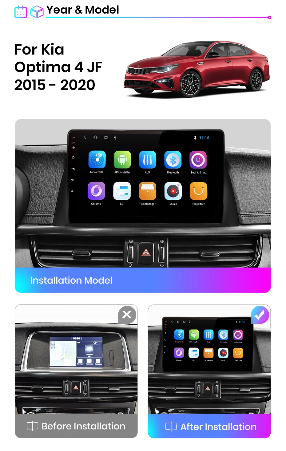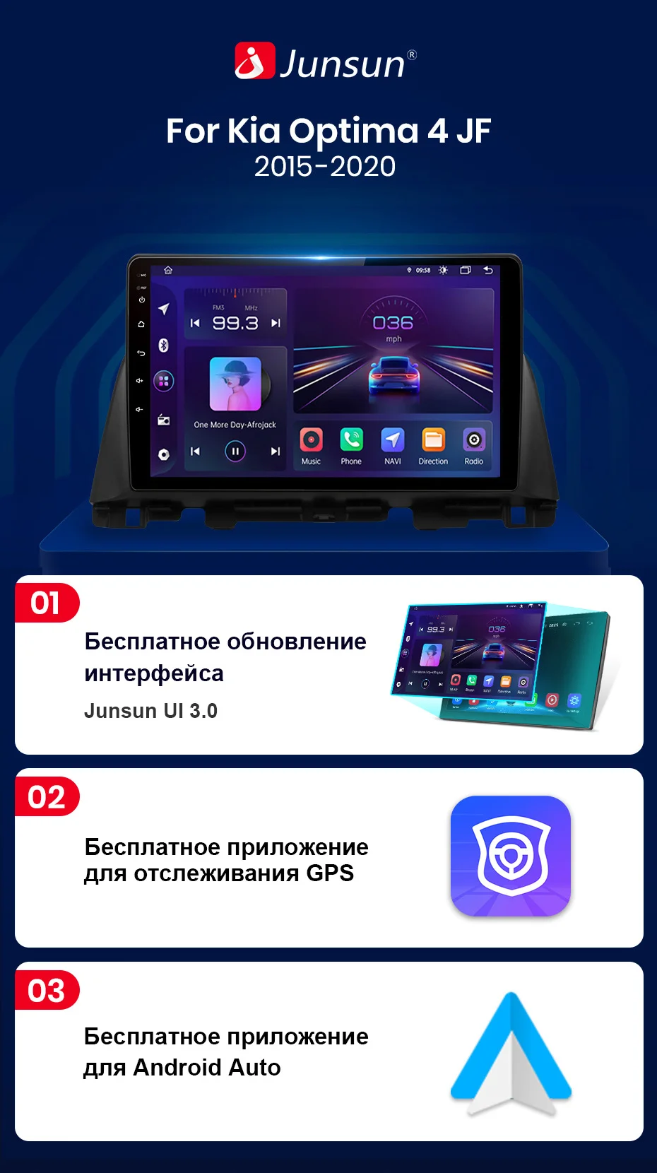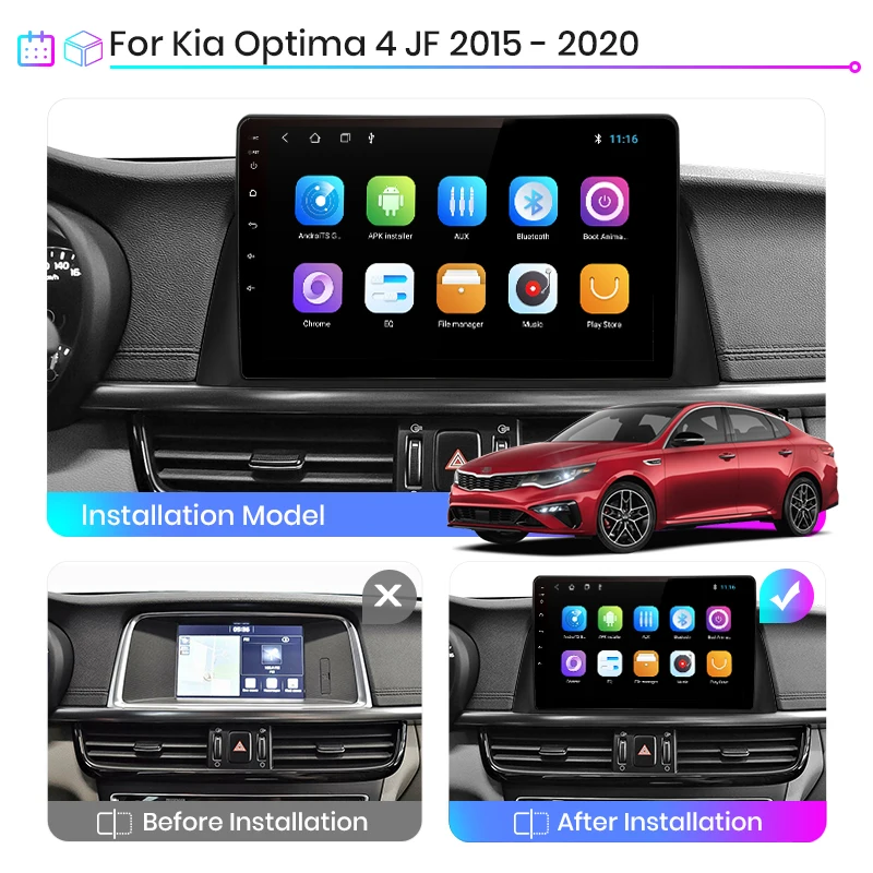 > Junsun V1 для Kia Optima 4 JF 2015 - 2020 функция> Основные функции: Android 10,0 + 10 дюймов IPS экран + Quad Core 1,2 ГГц (восемь ядер 1,8 ГГц Dual core опция) + DDR3 1 ГБ флэш-памяти (2 ГБ/4 ГБ/6 Гб опционально) + 16 Гб памяти (32 ГБ/64 Гб/128 Гб опционально) + WIFI (сеть 4G опционально) + зеркальная связь + управление рулевым колесом + RDS/DSP (опционально)> Специальные функции:1. PIN-PIN:Junsun радиокабель питания-pin, прост в установке;2. Встроенный Carplay/ Android Auto: Поддержка версии V1/V1Pro, просто используйте кабель телефона, подключите его, стабильный и простой в использовании;3. Поддержка подголовника: только поддержка версии Junsun V1;Дополнительные аксессуары> Голосовое управление AI: Просто скажите слово команды Управляйте радио без рук, сделайте диск более безопасным> ADAS DVR камера, мониторинг давления в шинах, OBD2, внешний микрофон, RCA кабель;