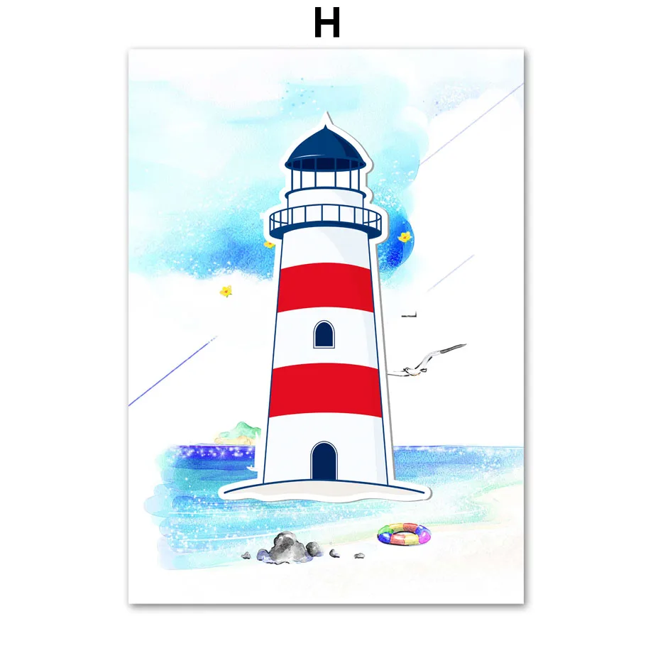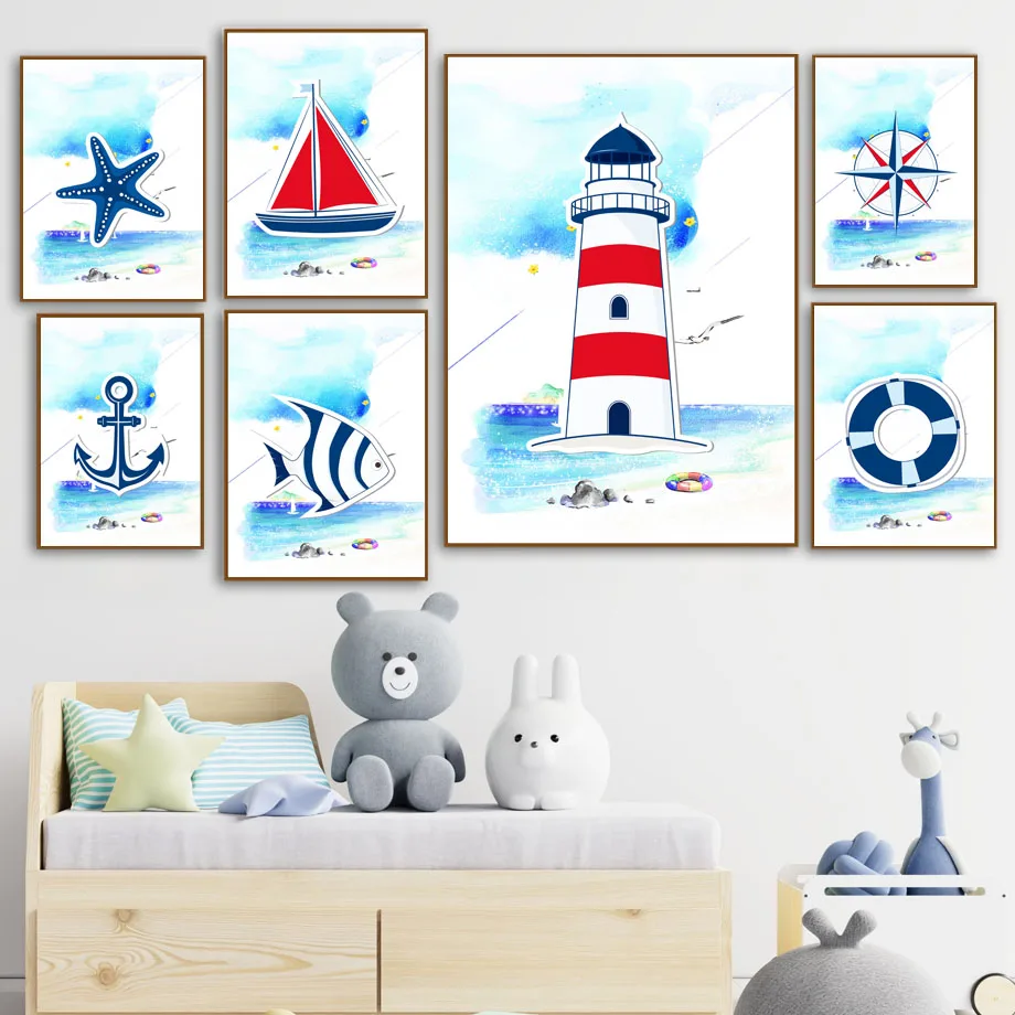 Скандинавская настенная Картина на холсте, Пляжная лодка, рыба, морская звезда, якорь, рандомная картина, декоративные фрески для детской комнаты