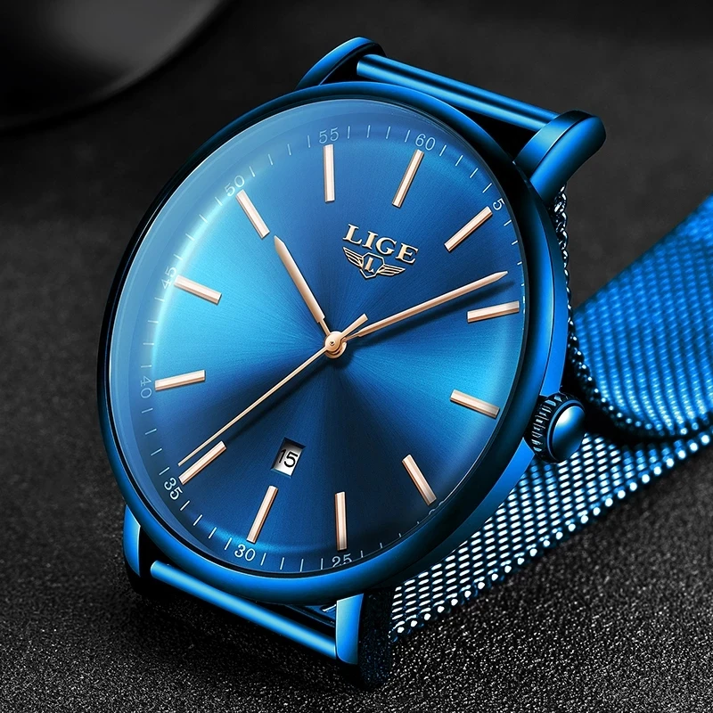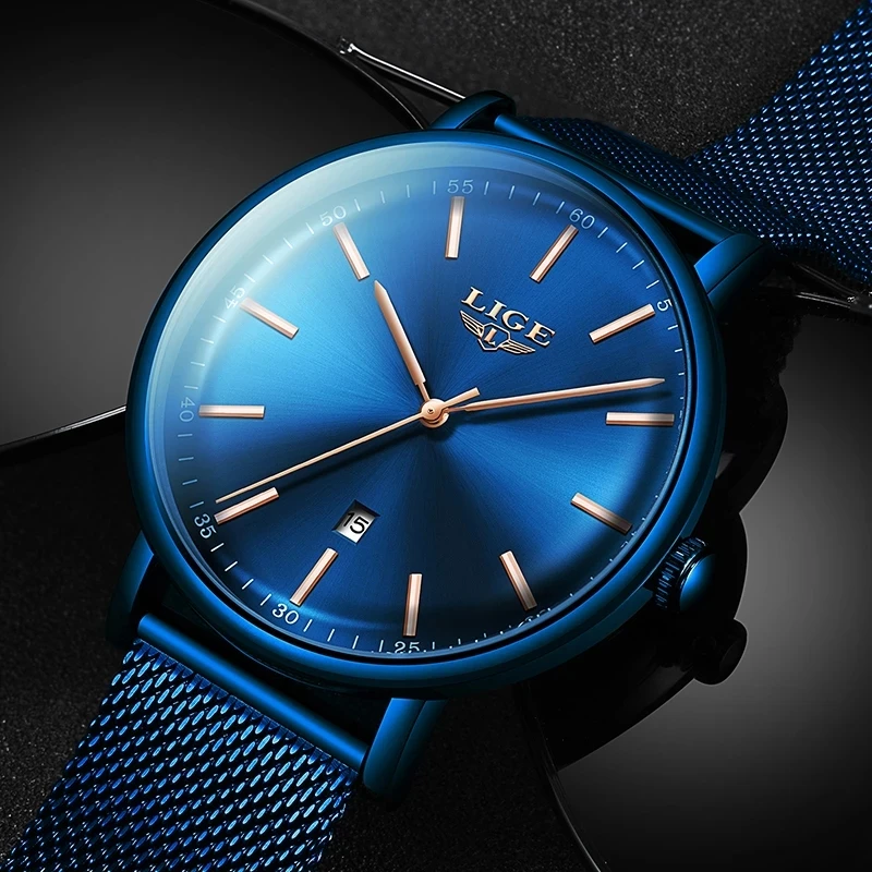 Часы наручные LIGE мужские водонепроницаемые, брендовые Роскошные повседневные кварцевые спортивные с синим сетчатым ремешком и коробкой, 2021