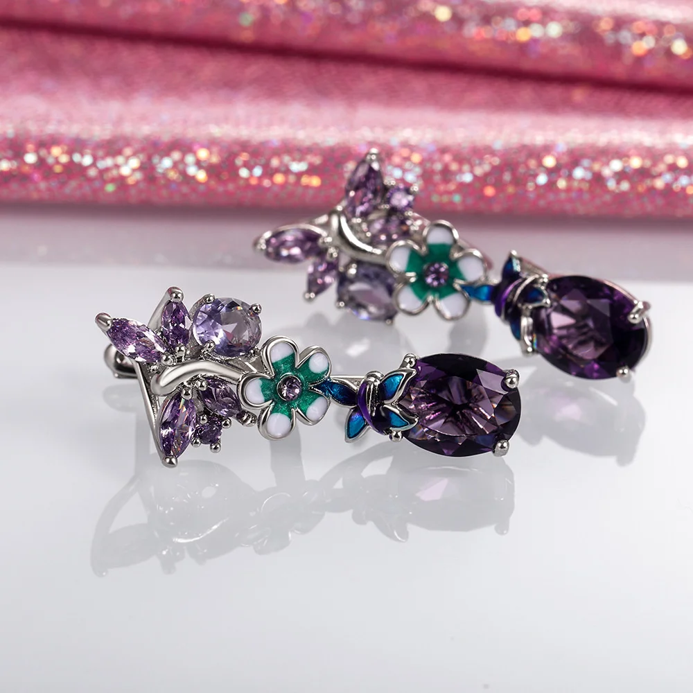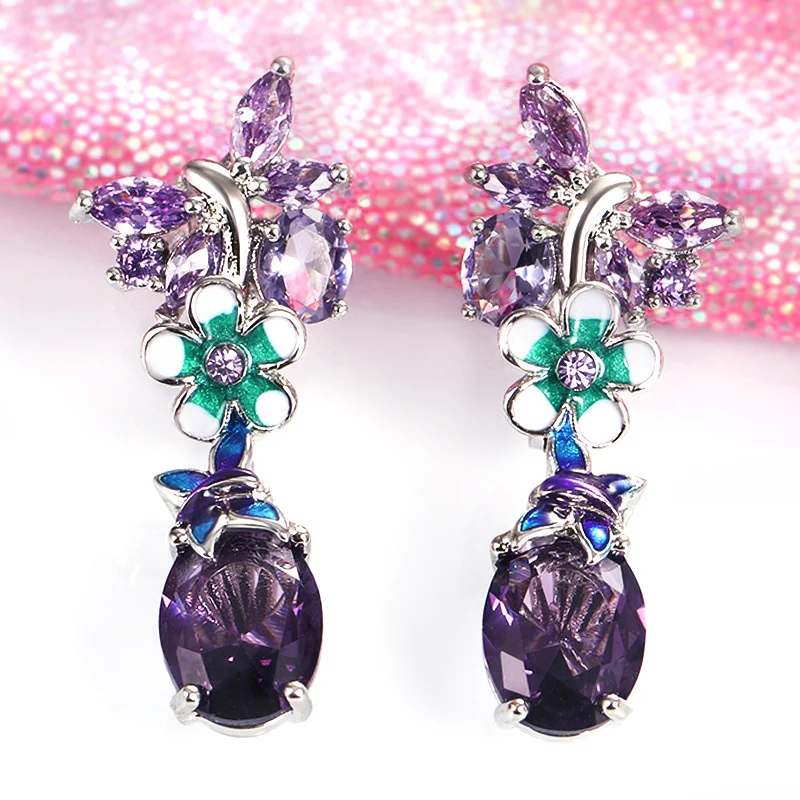 JoiasHome серебряные ювелирные изделия драгоценные камни 925 Серьги овальные фиолетовые циркониевые цветы женские популярные серьги-подвески с бабочками для свадебной вечеринки