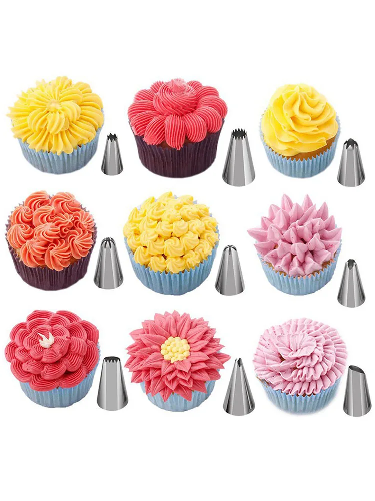 205 шт.:48 x Насадки для украшения из нержавеющей стали (маленькие)1 x Таблица рисунков2 шпатели (прямые и угловые)1 x силиконовые кондитерские мешки100 х одноразовый для глазури мешок трубопровода1 x муфтыРасческа для торта 3 шт.1 x торт Гладкий1 x ручка для написания торта3 насадки для ручекЧистящая Щетка-1 шт.2 x Цветочные ногти1 x Ножницы для цветов40 x Маффин формы «Стакан»