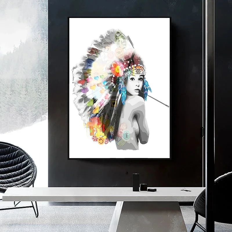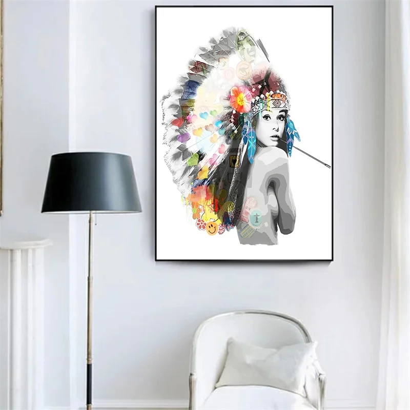 Абстрактная индийская девушка с цветными перьями, холст, картина, Сексуальная голая девушка, плакат и печать, настенное искусство, картина, домашний декор для спальни