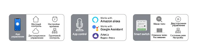 Реально классные реле. Маленькие по размеру, приятные тактильно. Моментально подцепил к Tuye Smart , а потом к Алисе. Ничего лишнего , очень удобно для задач включить-выключить + голосовое управление и доступное программирование управлением в приложении.