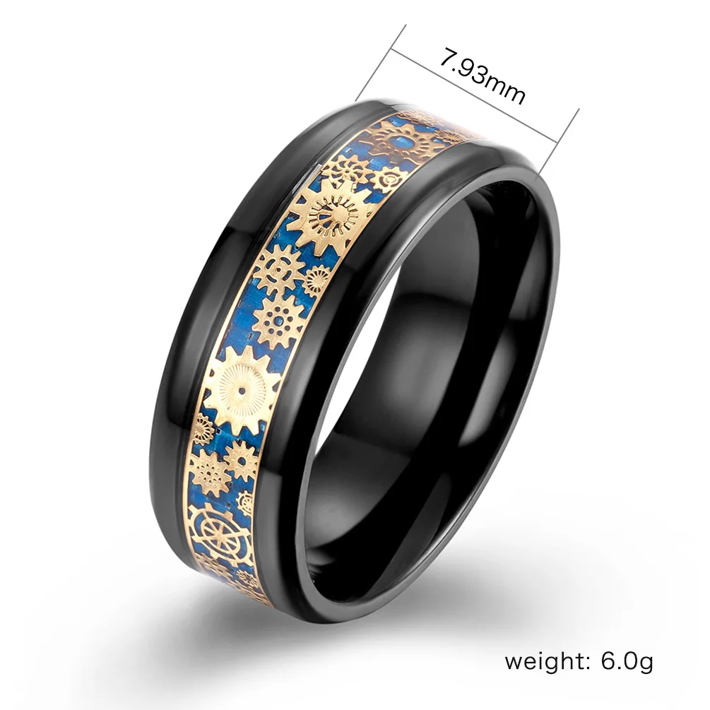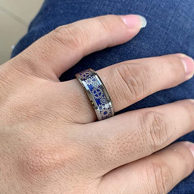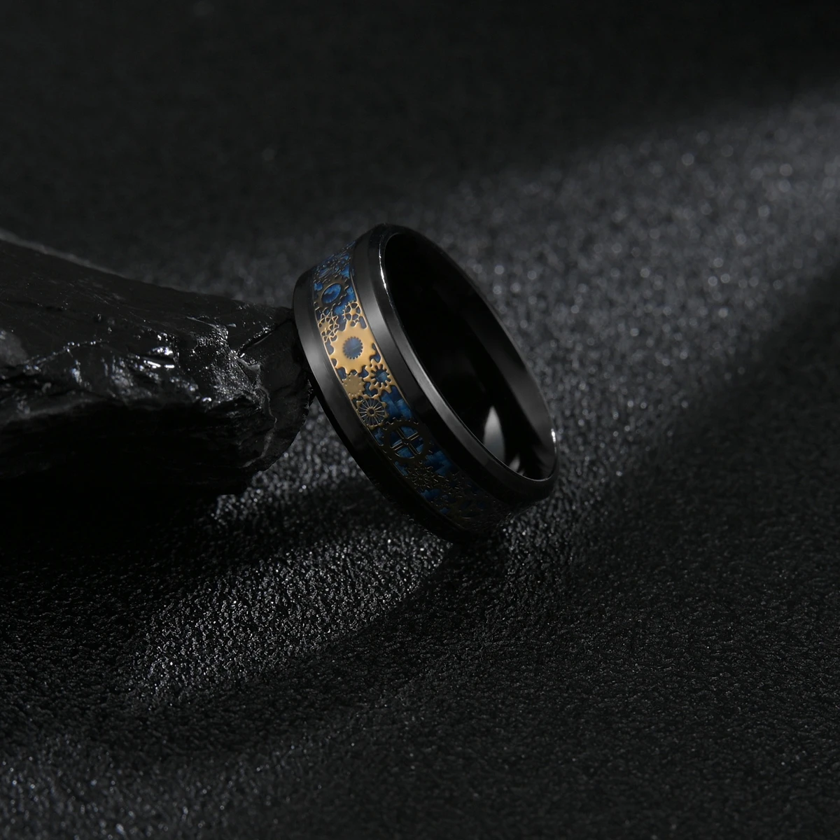 Мужское кольцо, механическое зубчатое колесо, кольцо из нержавеющей стали, скошенные края с синим углеродным волокном, инкрустация, ювелирные изделия на заказ, гравировка