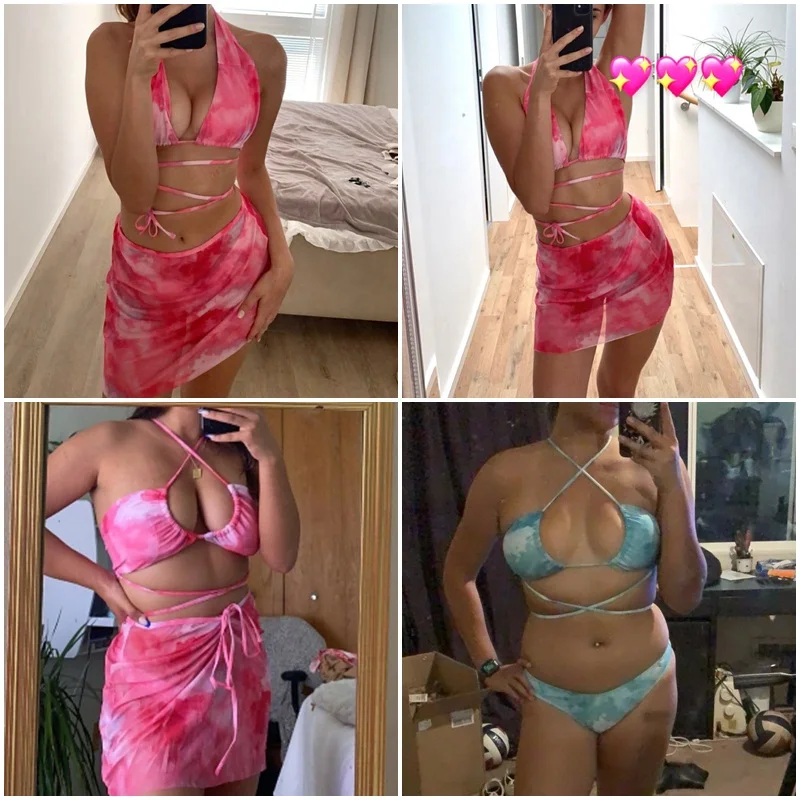 Бикини-бандо In-X, женский розовый купальник с принтом, комплект из 3 предметов, стринги с лямкой через шею, сексуальный летний купальный костюм, 2021