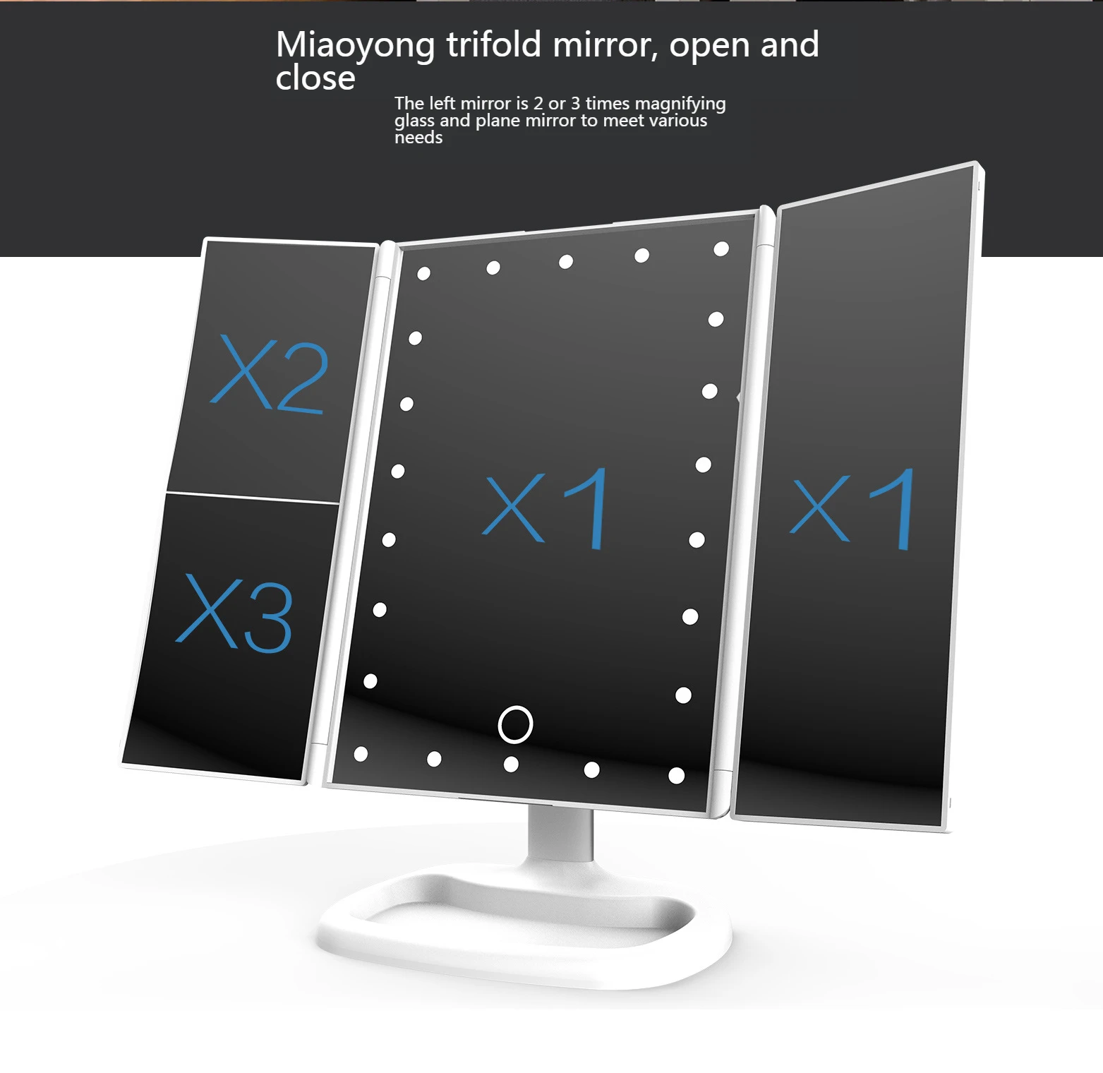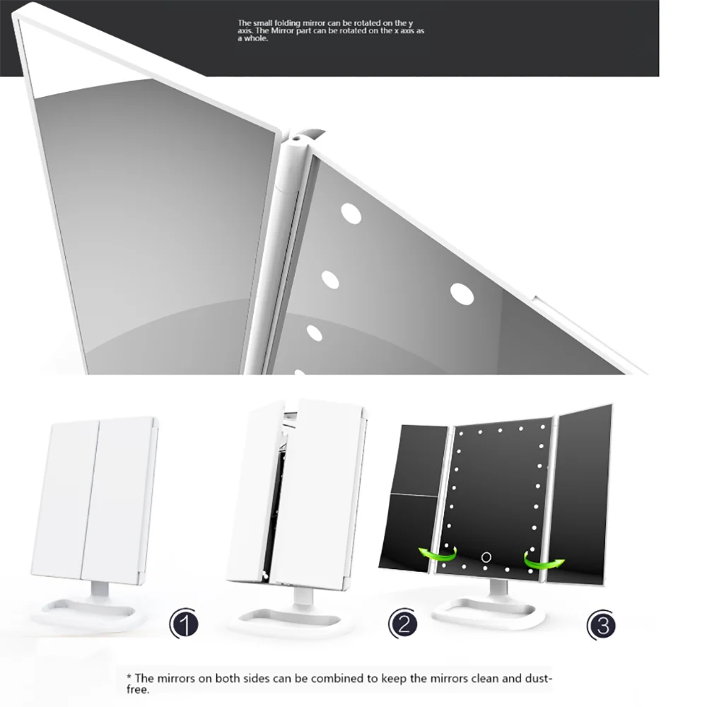 Цвет: белый/черный/розовое золотоМатериал: АБС-пластикСветодиодный светильник: 22 шт. светодиодныйСредний Зеркало Размер: 7x9,2 дюймовБоковое зеркало Размер: 3,5x9,2 дюймовСветодиодный Режим управления: сенсорный экран вкл/выкл, длительное нажатие на режим тусклый.Источник питания: 4 * AAA батареи (не входят в комплект) или USB зарядка