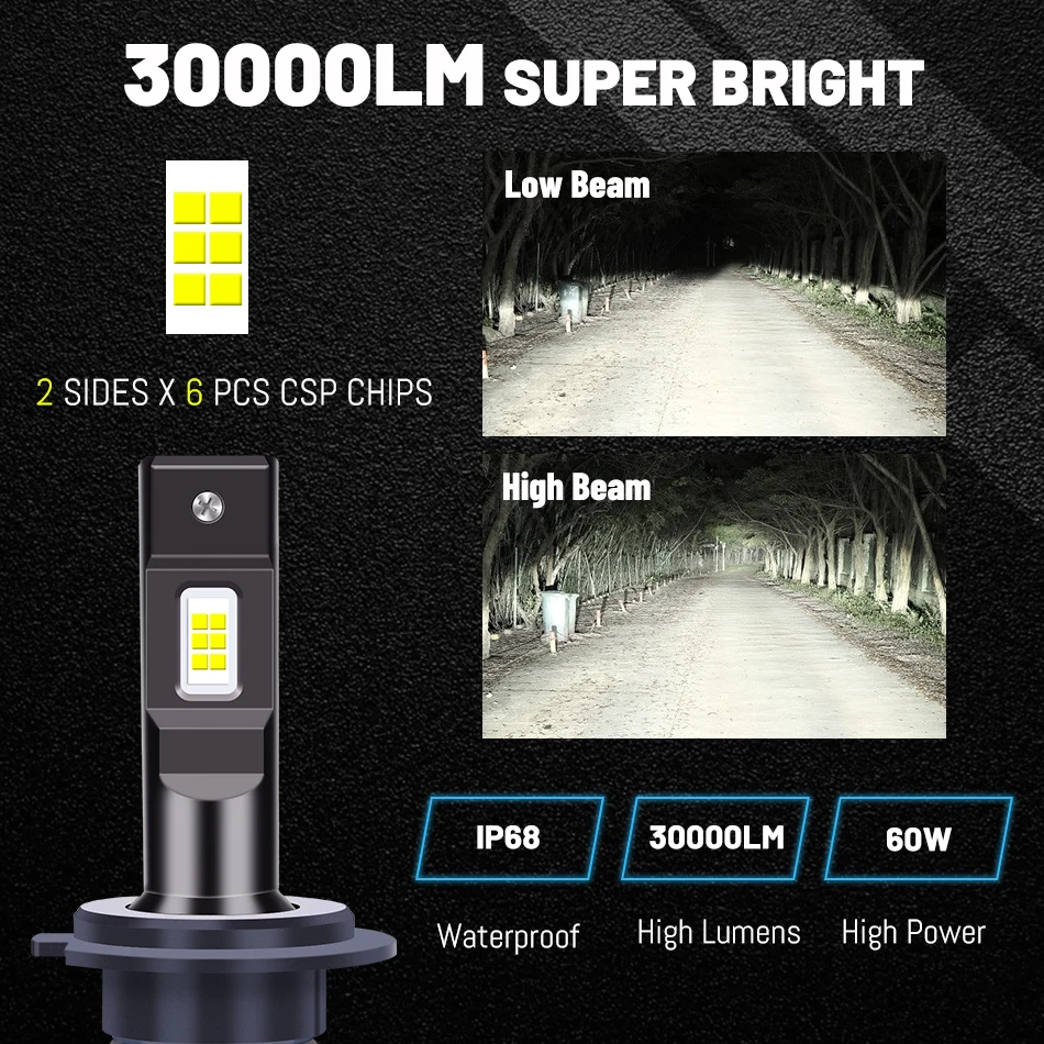 (1) светодиодная фара 30000LM/пара, каждая лампа 15000lm, супер яркая.(2) один светильник имеет 2 стороны 12 шт CSP чип.(3) Этот продукт 6500k, чисто белый светильник.(4) Мощность этого продукта составляет 60 Вт/пара, каждая лампа 30 Вт.