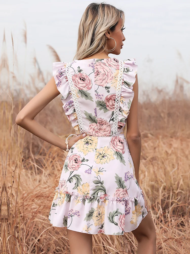 Для женщин и рукавами-крылышками для девочек, с круглым вырезом, Цветочный принт летнее платье с завышенной талией и оборками Лоскутная Бохо Повседневная Уличная пляжная вечерние мини-платья