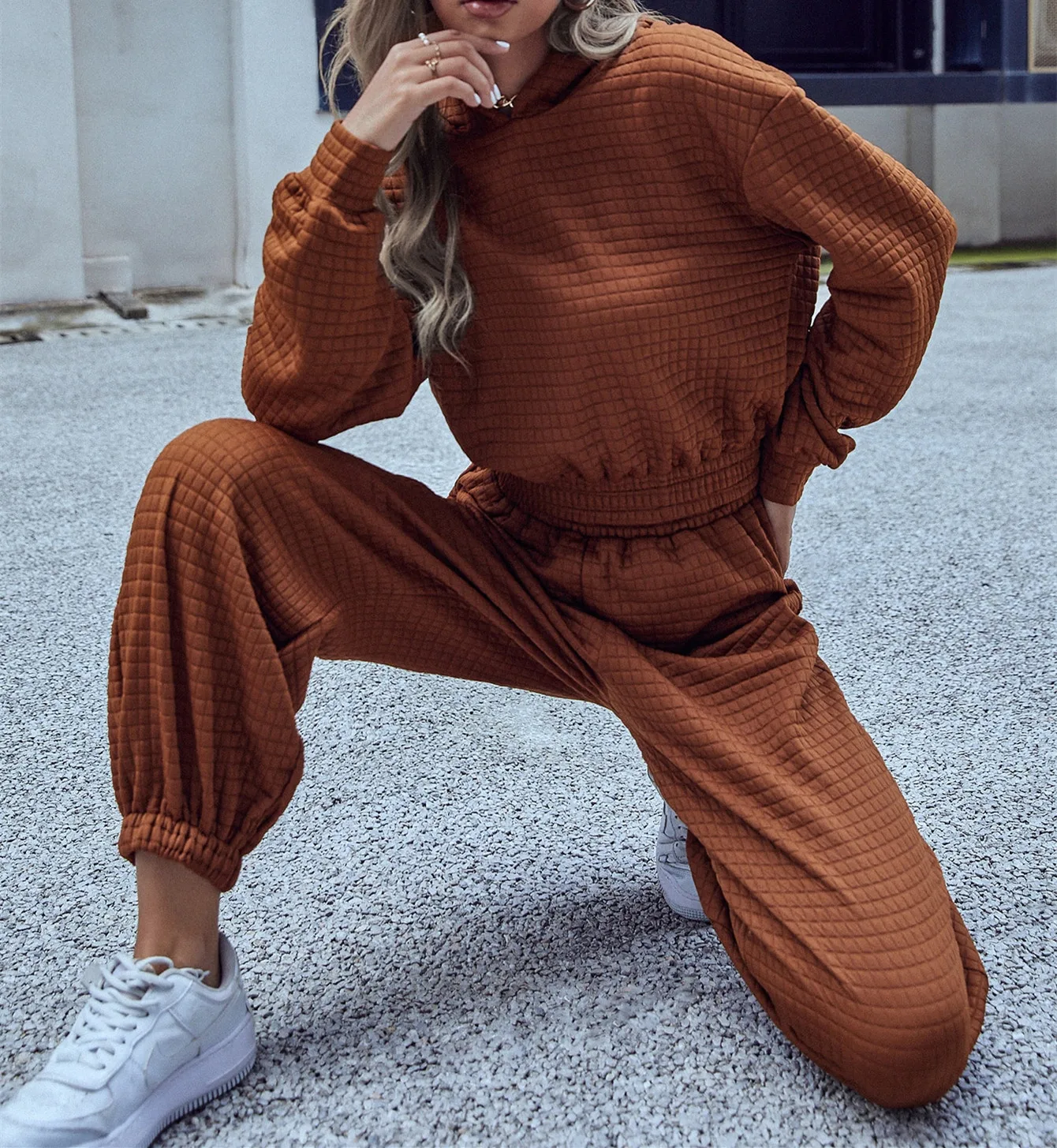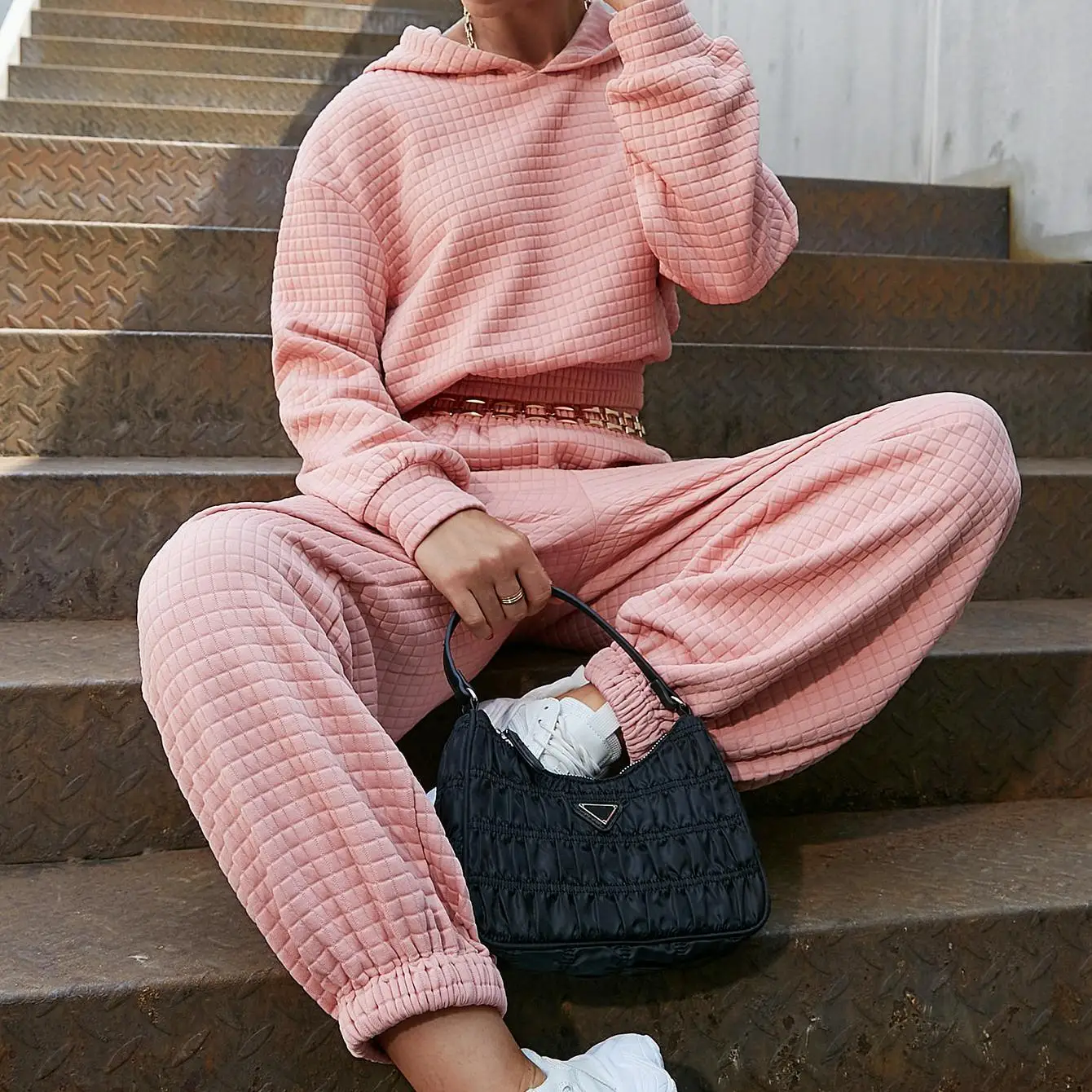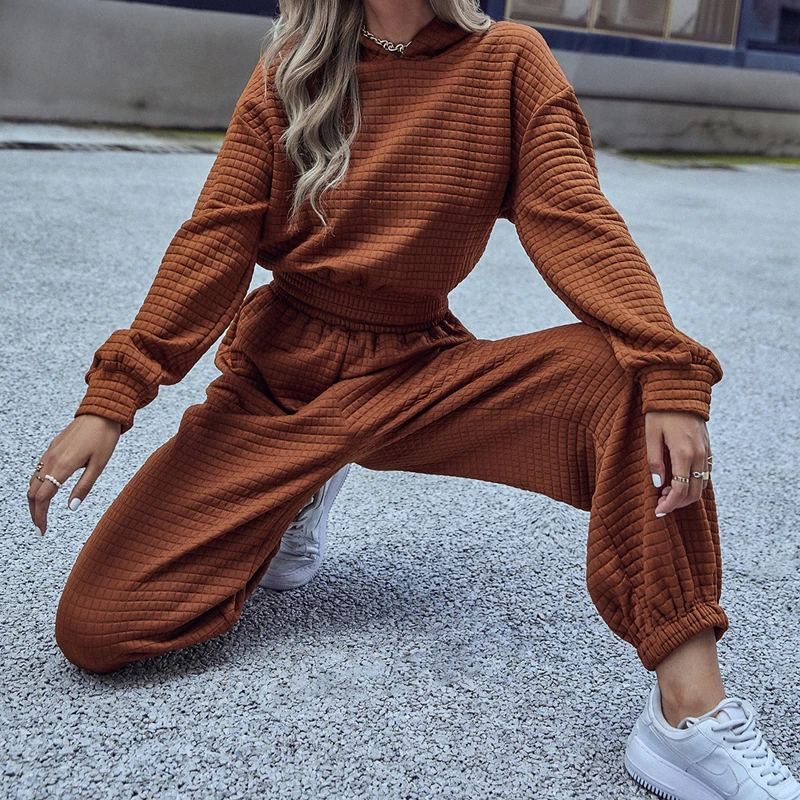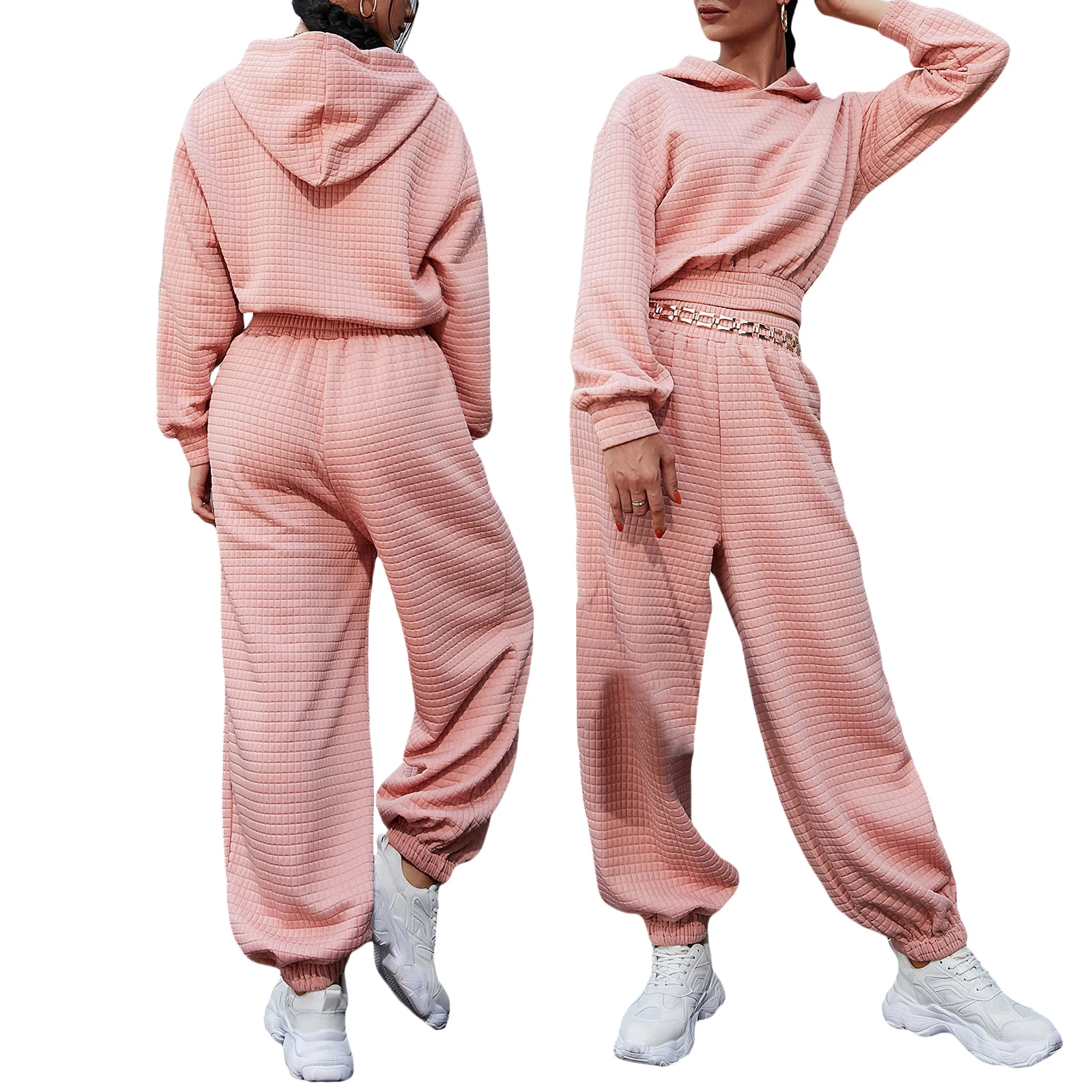 Женский комплект из 2 предметов, однотонный топ с длинным рукавом и капюшоном + брюки до щиколотки с цепочкой, 4 цвета