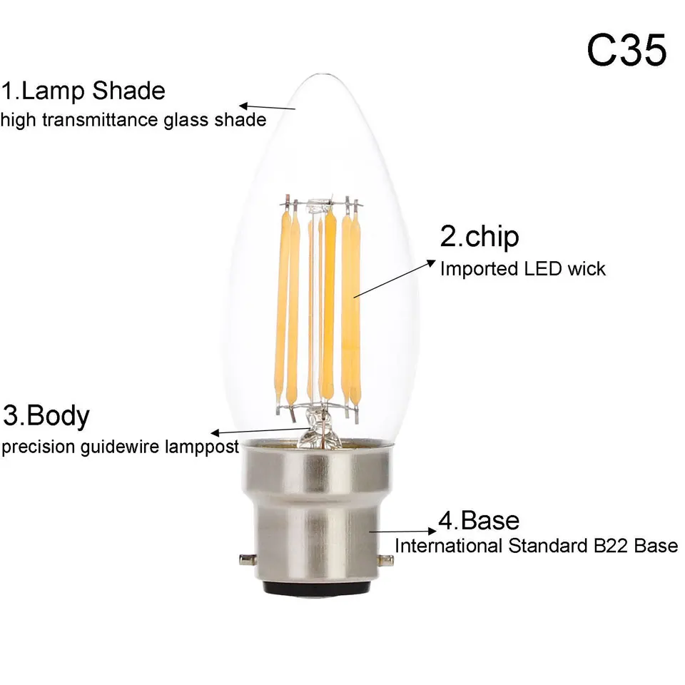 10 шт. B22 Led лампы в форме свечи лампы типа Свеча), 2 Вт, 4 Вт, 6 Вт COB Светодиодная лампа 220 В Ретро лампа накаливания Эдисона Светильник лампы C35 светильник для дома люстра светильник Инж