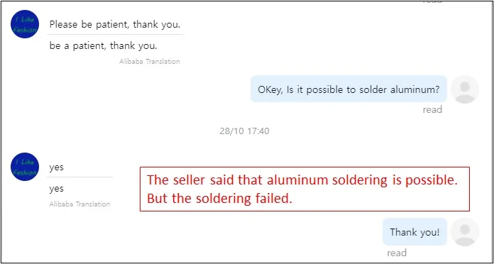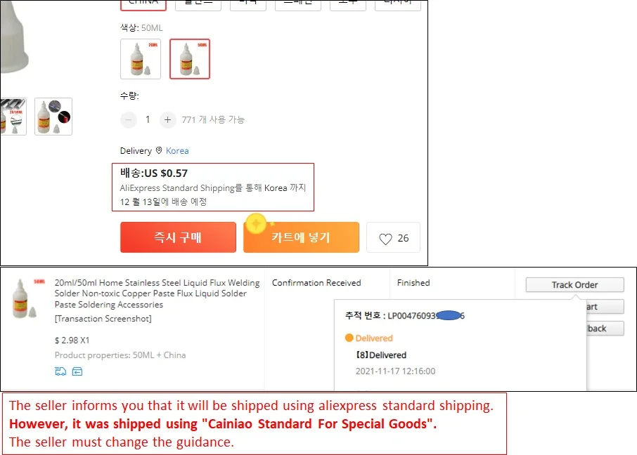 주문 : 10월 25일 도착 : 11월 17일 야기안테나 만드려고 알루미늄 엘리먼트를 납땜해보려고 샀는데 판매자는 알루미늄 납땜도 가능하다고 말했지만 전혀 납땜되지 않습니다. 급하게 해야 해서 AliExpress Standard Shipping를 이용하여 배송하는 판매자를 찾아 구입하였지만 액체는 AliExpress Standard Shipping를 이용할 수 없다고 하며 Cainiao Standard For Special Goods로 배송하였습니다. 구입 시 주의하세요. 이 제품은 절대 AliExpress Standard Shipping으로 배송하지 않습니다.