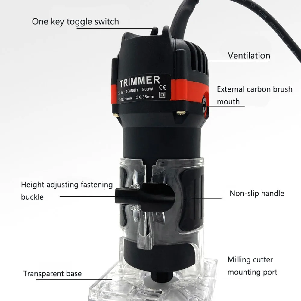 Особенности:С прозрачной основой, обрабатывающая работа может быть четко просмотрена.Принимает полностью Медный двигатель с сильной мощностью, он имеет более стабильную производительность.Многоапертурная вихревая тепловыделение, быстрое тепловыделение и не горящая машина.Внешний дизайн угольной щетки удобен для замены.Высота основания может быть скорректирована для удовлетворения различных потребностей.Легкий с проводным дизайном, удобный для повседневной эксплуатации и переноски.Подходит для резки древесины, обрезки, прорезывания и изготовления отверстий.Используется для обработки дерева, обработки шкафа, рукоделия.Характеристики:Вилка: штепсельная вилка европейского стандарта, штепсельная вилка американского стандарта (опционально)Цвет: черный + красныйМатериал: металл + пластикМощность: 800 ВтСкорость без нагрузки: 30000 об/минМощность Длина кабеля: 1,8 мЦанговый диаметр: 6,35 мм (1/4 ")Размер товара: 200*86*78 мм/7,9*3,4 * 3.1inВес изделия: 1800 г/фунтовПосылка Размер: 235*130*110 мм/9,3*5,1 * 4.3inПосылка Вес: 1900 г/4.2lbУпаковочный лист:1 * электрическая машина для обрезки2 * гаечный ключ1 * набор инструментов для установки