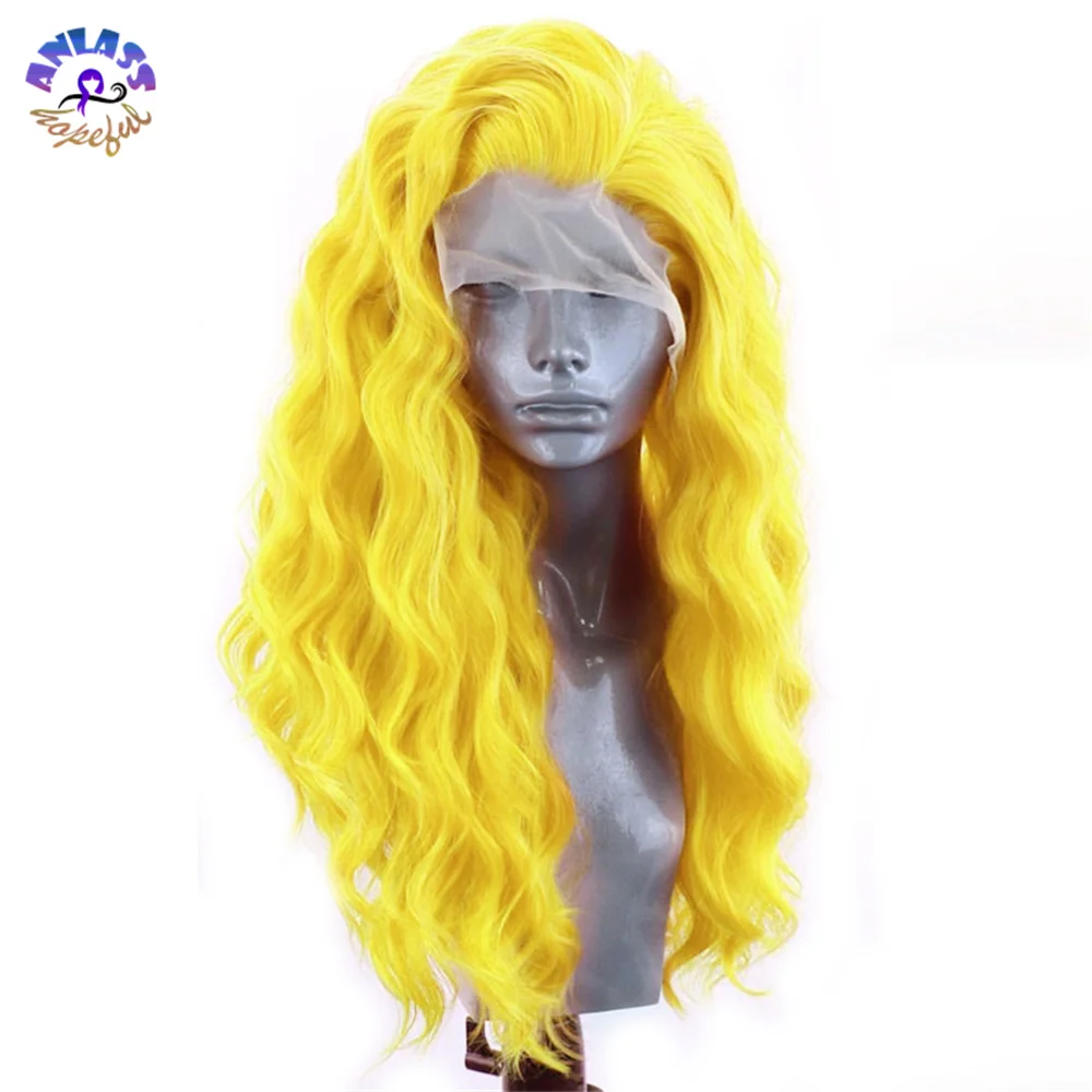 Парик для косплея Женский, свободная часть, с волнистыми кружевами спереди, желтый синтетический, термостойкий, без клея