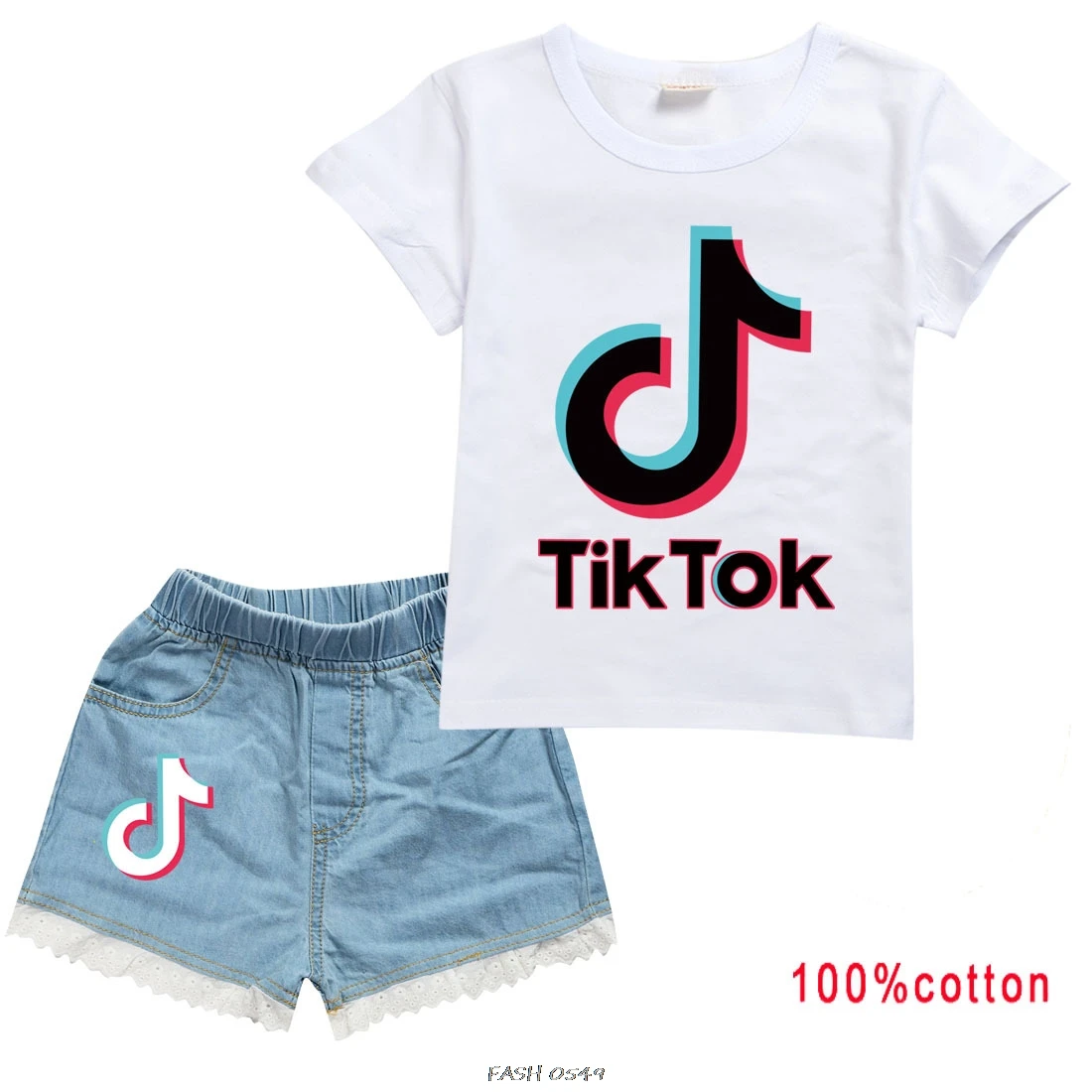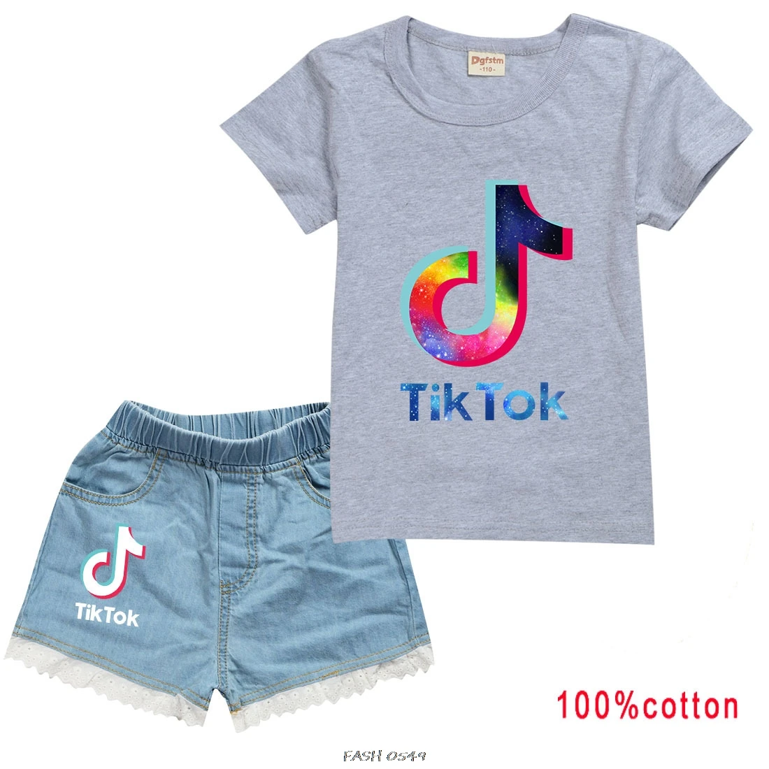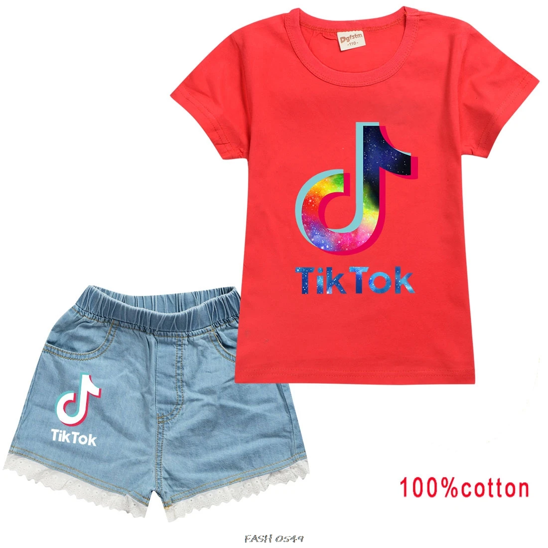 Комплект модной детской летней повседневной одежды Tik Tok футболка с набивным рисунком + детские джинсы для маленьких детей, комплект одежды из хлопка для девочек; Комплекты с шортами