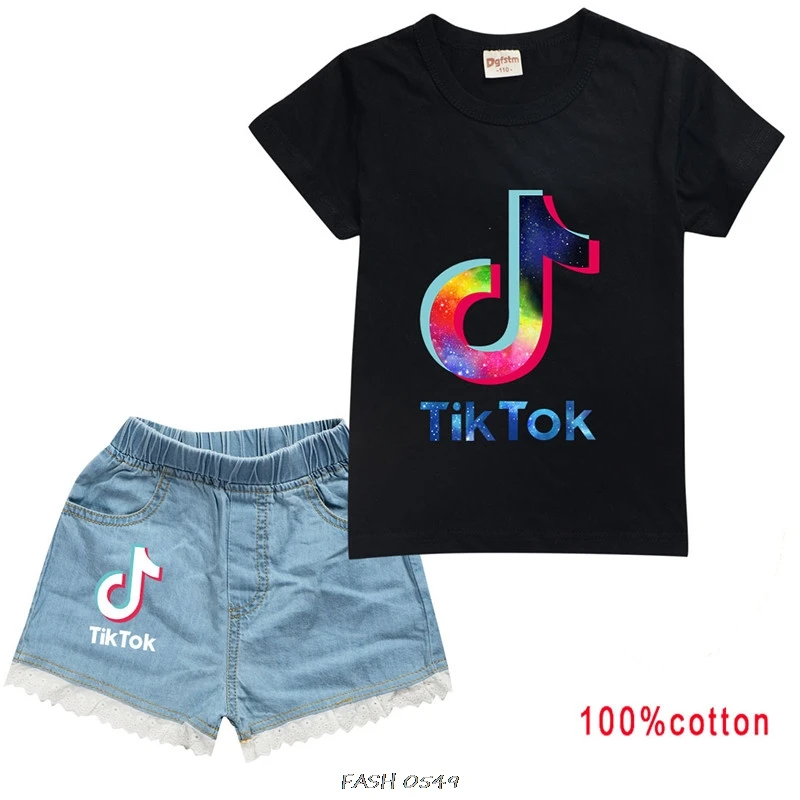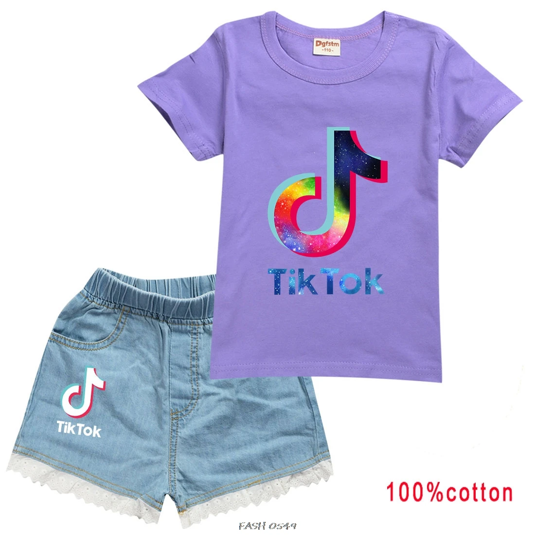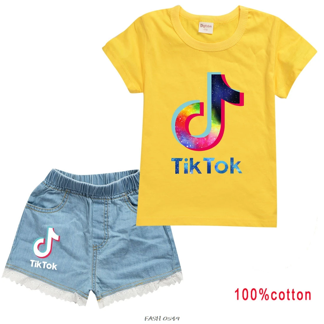 Комплект модной детской летней повседневной одежды Tik Tok футболка с набивным рисунком + детские джинсы для маленьких детей, комплект одежды из хлопка для девочек; Комплекты с шортами