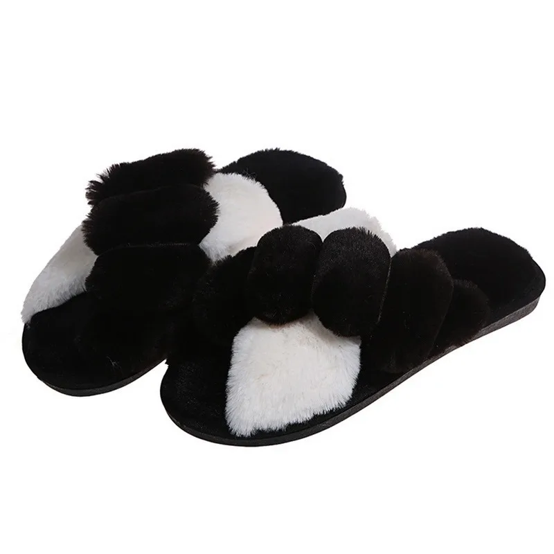 Тапочки женские домашние меховые, теплые, без застежки, плоская подошва, сланцы, черный розовый цвет, простые Тапочки