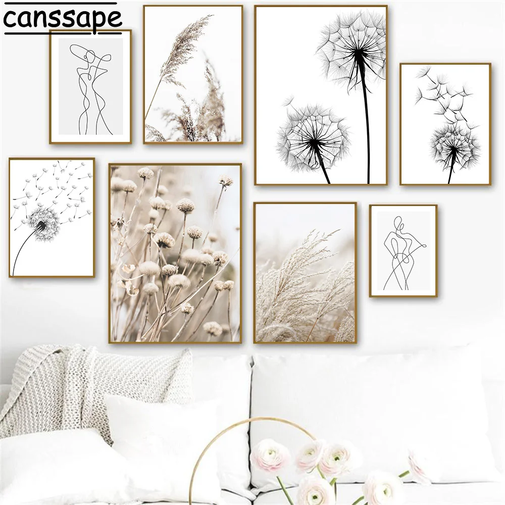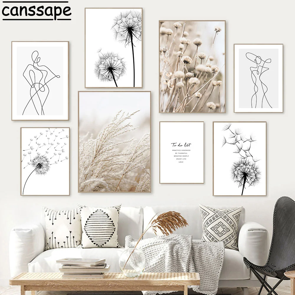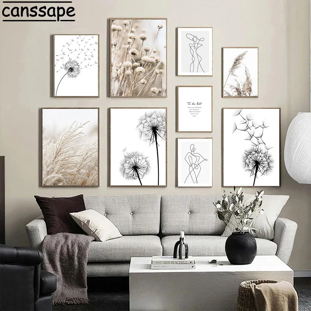 Рисунок одуванчика, черно-белый холст, плакат, Рисунок язычков, Минималистичная линия, рисунок, скандинавские настенные картины, декор для гостиной